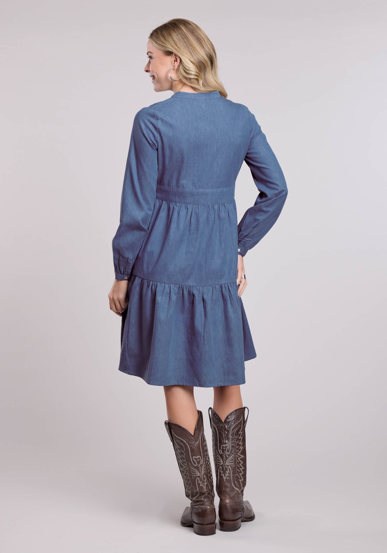 Womens Long Sleeve Dress Button Med Blue Cotton Denim Peasant Western