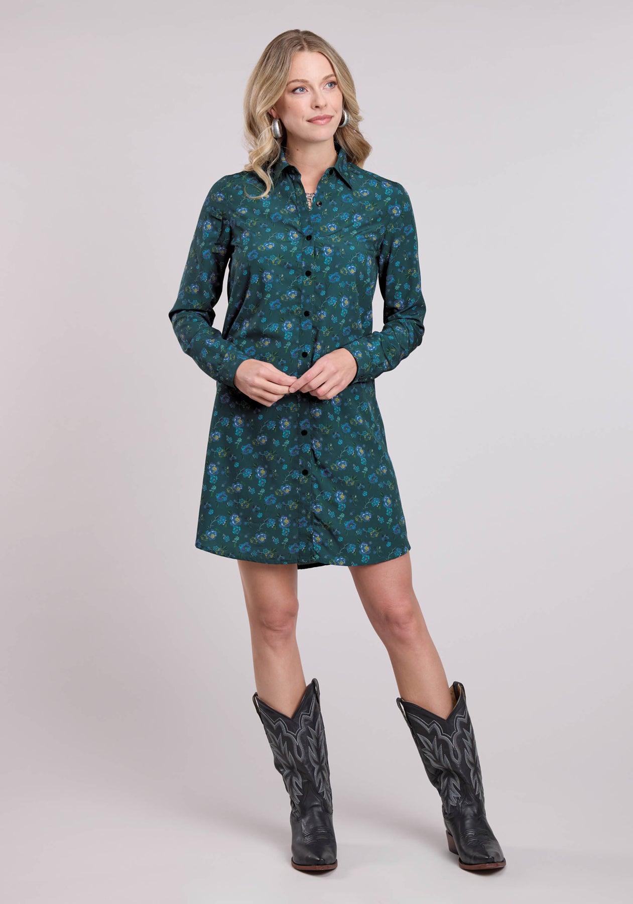 WOMENS LONG SLEEVE DRESS BUTTON POLY CREPE TEAL FAUX EMBROIDERED PRINT WESTERN DRESS
