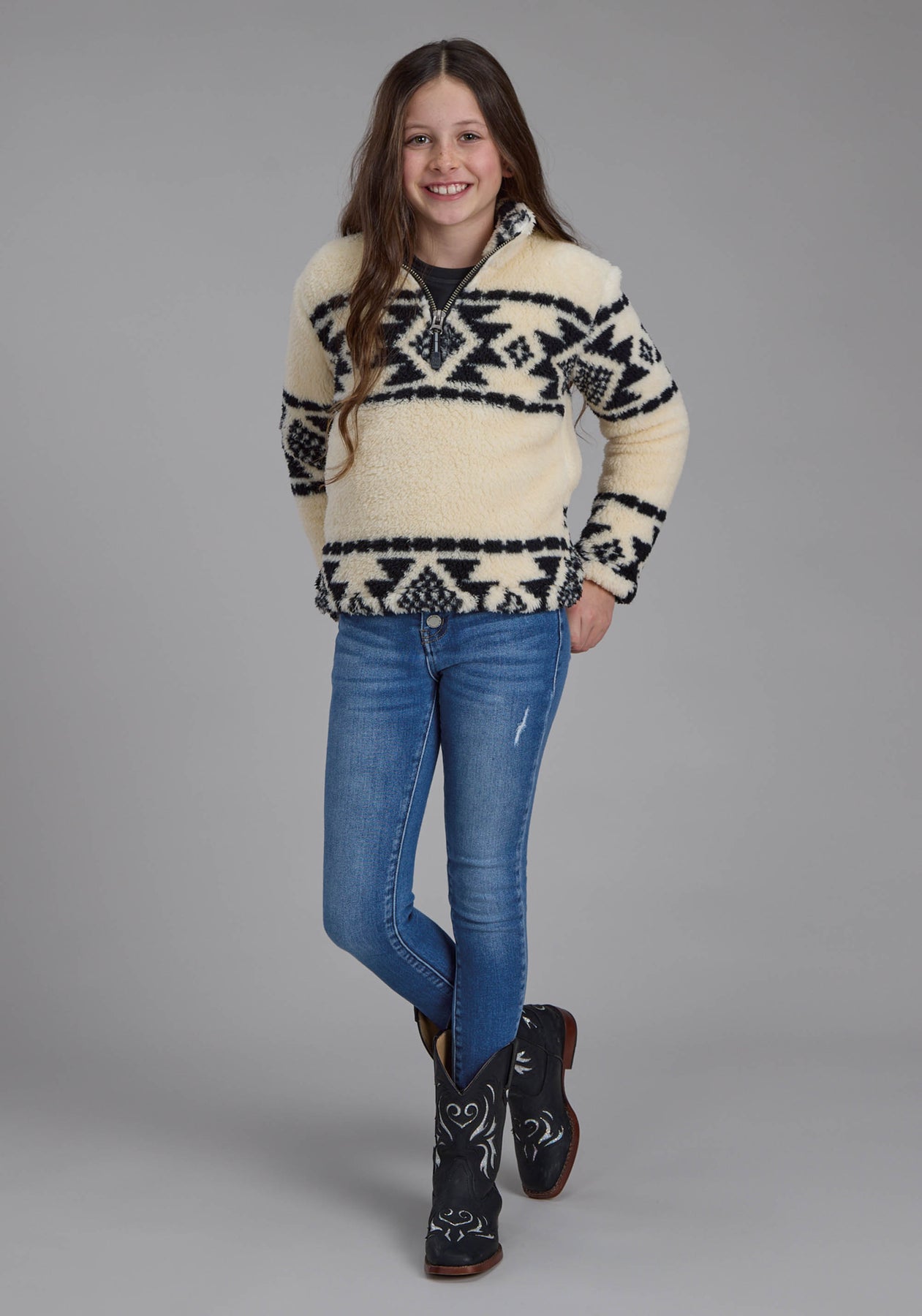 Girls Black Cream Aztec Stripe Snap Jacket