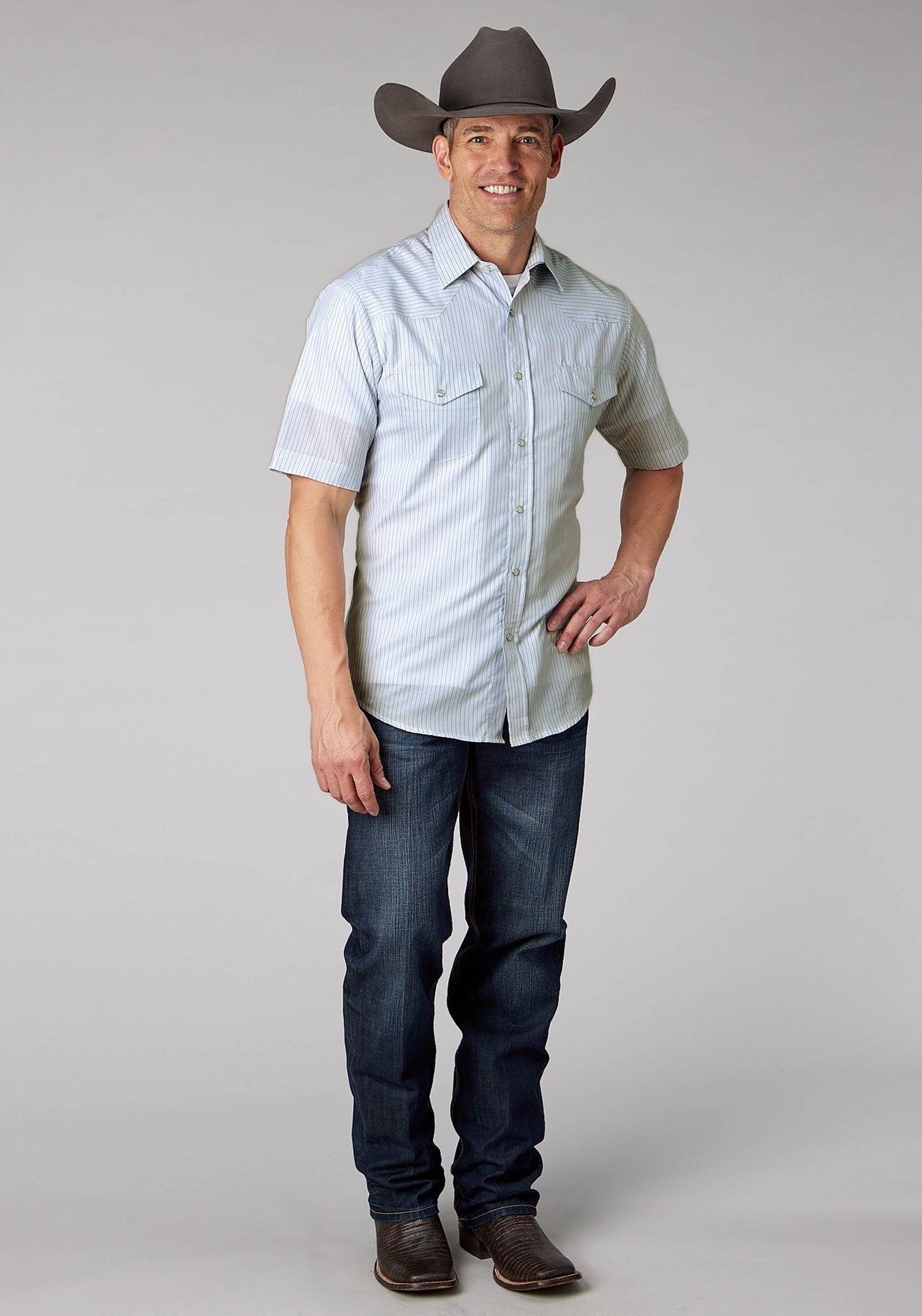 MENS LIGHT BLUE CHARCOAL WH STRIPE SHORT SLEEVE SNAP WESTERN SHIRT