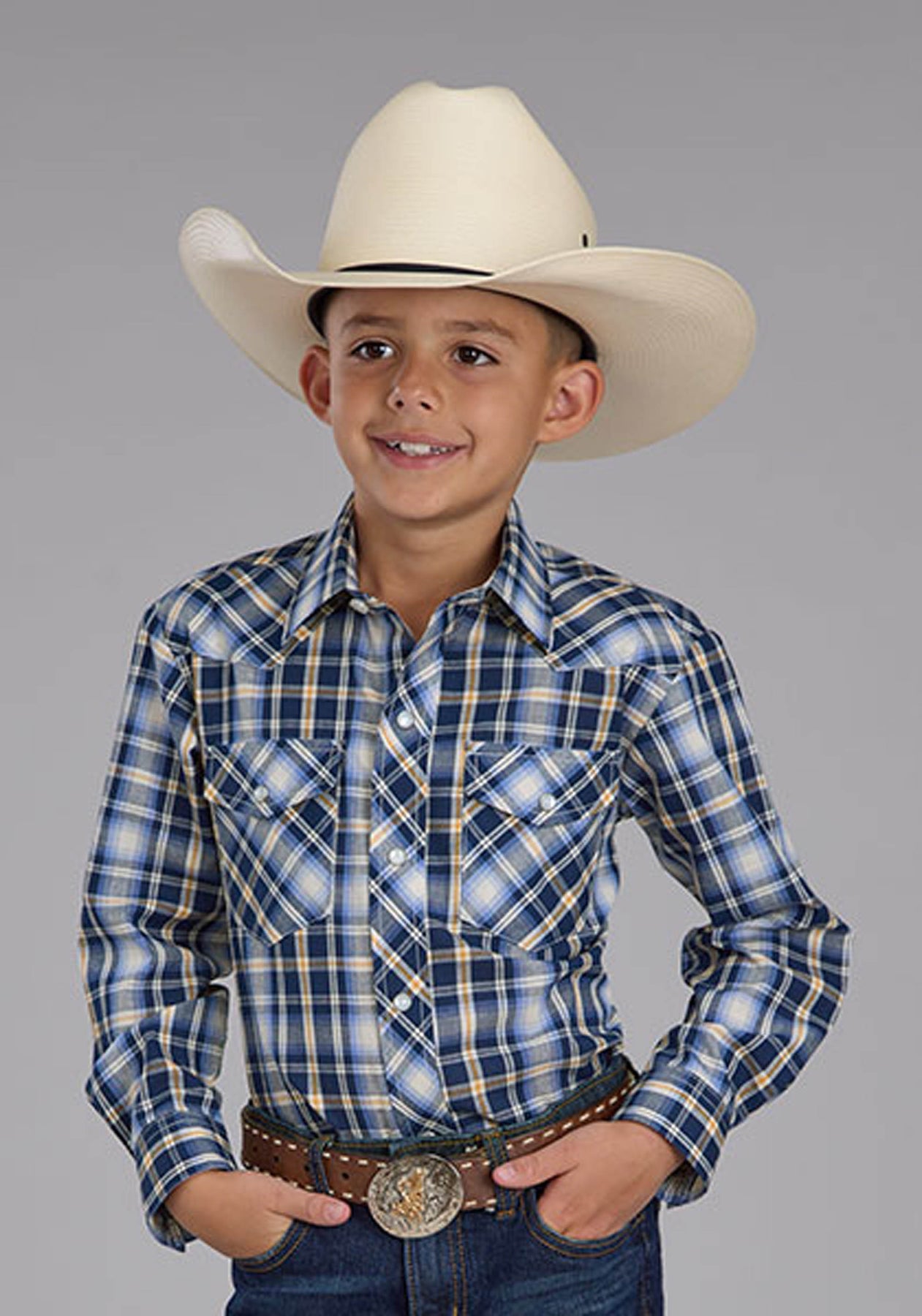 BOYS LONG SLEEVE SNAP NAVY LIGHT BLUE GOLD PLAID WESTERN SHIRT