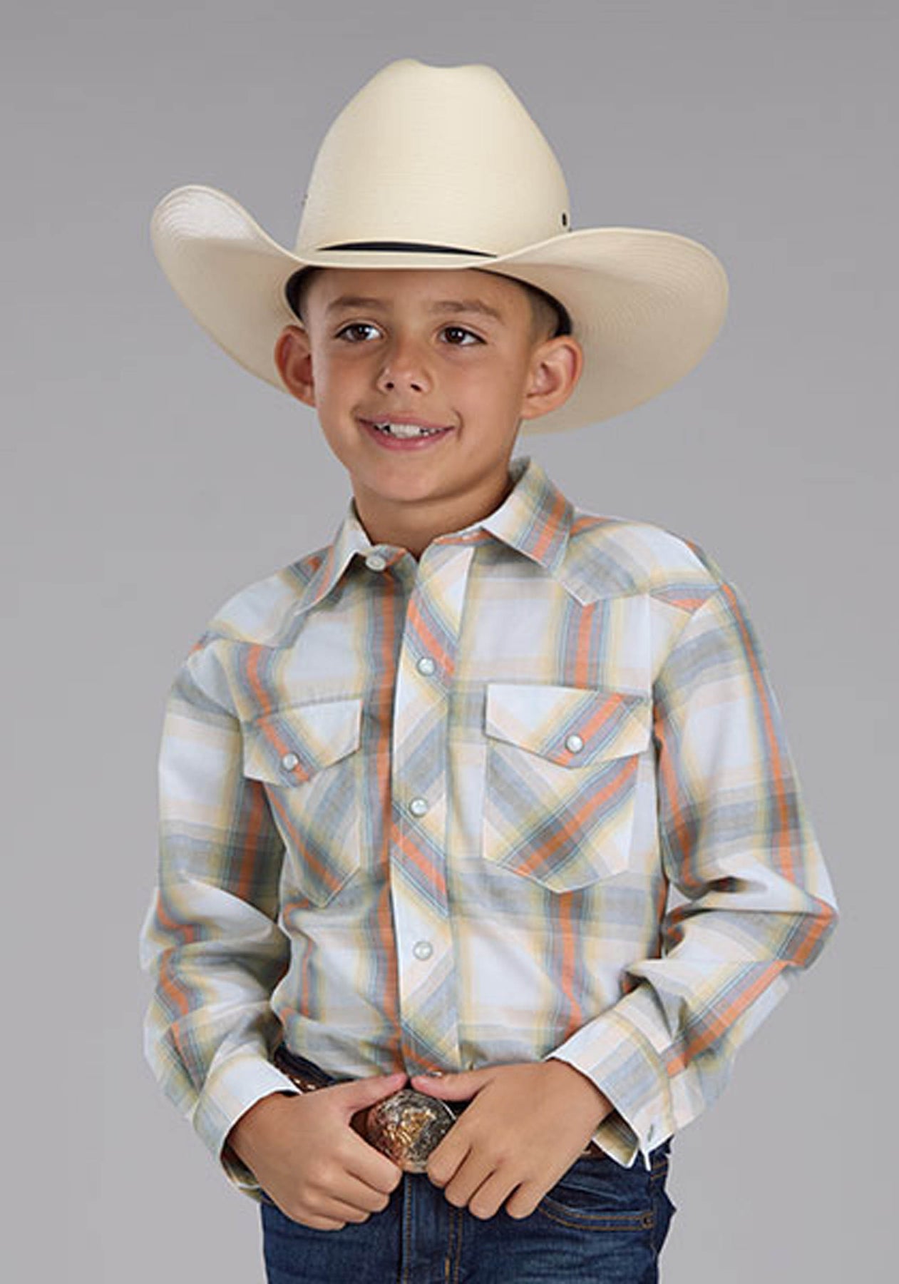 Boys Long Sleeve Snap Cream Steel Blue Tangerine Plaid Western Shirt