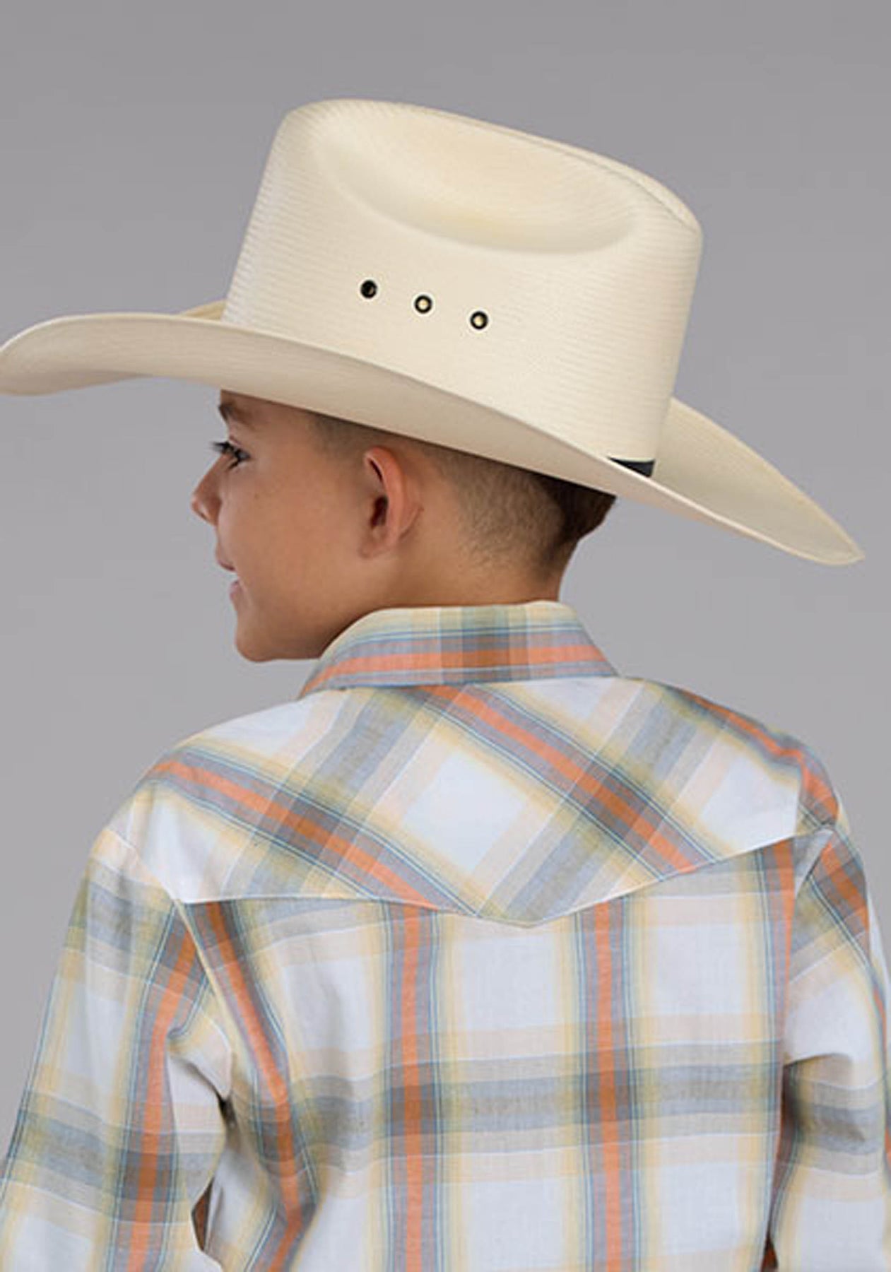 BOYS LONG SLEEVE SNAP CREAM STEEL BLUE TANGERINE PLAID WESTERN SHIRT
