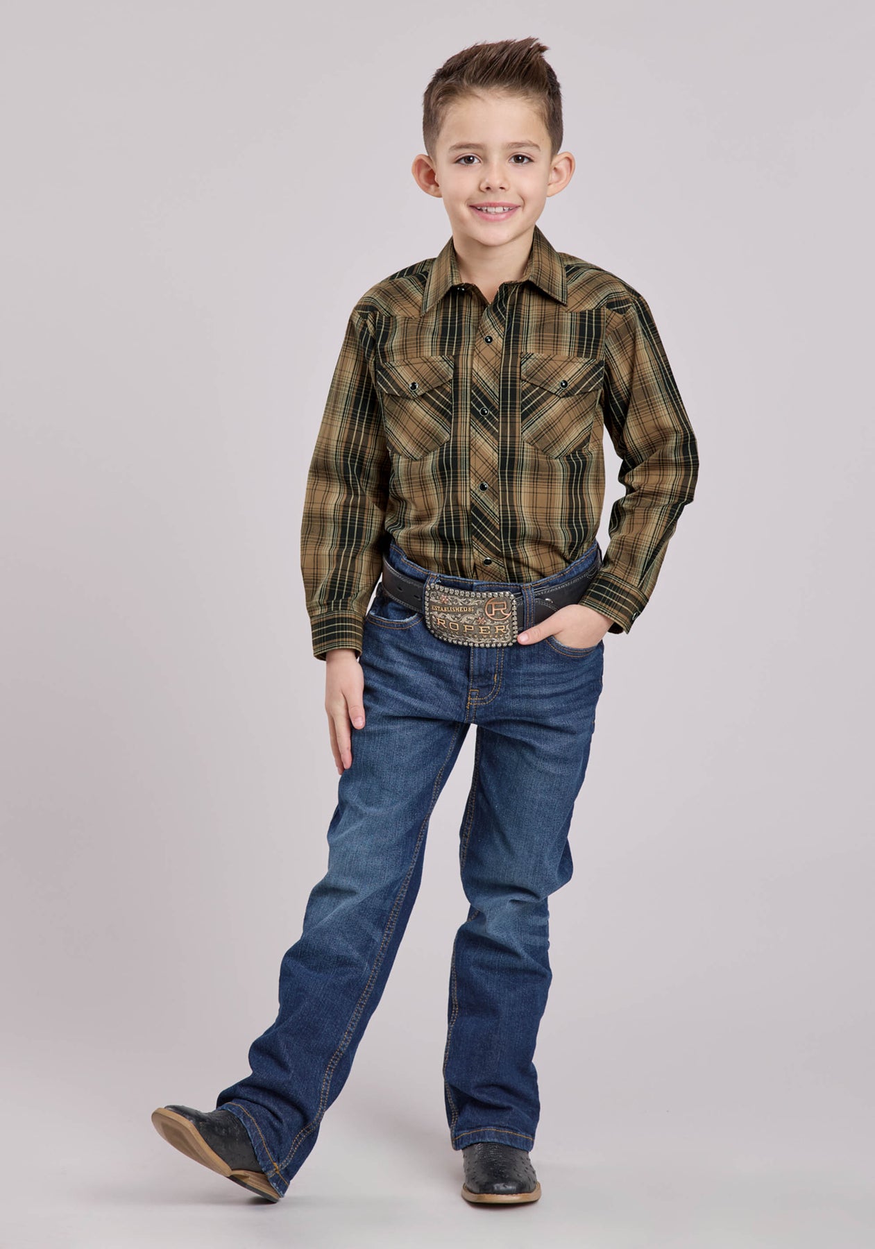 BOYS LONG SLEEVE SNAP BROWN BLACK TAN PLAID WESTERN SHIRT