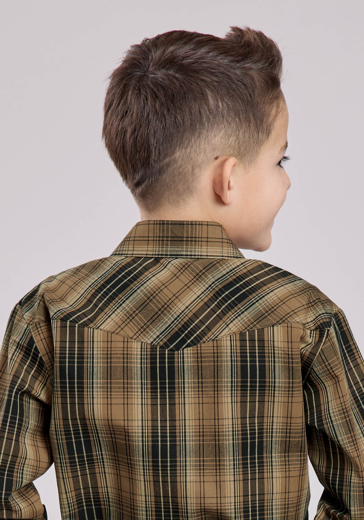 Boys Long Sleeve Snap Brown Black Tan Plaid Western Shirt