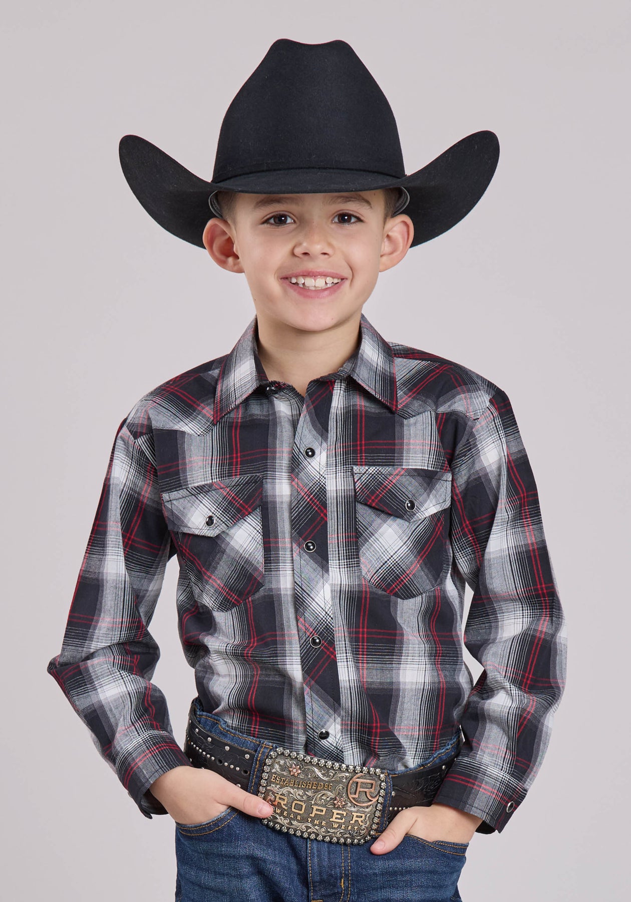 BOYS LONG SLEEVE SNAP BLACK WHITE RED PLAID WESTERN SHIRT