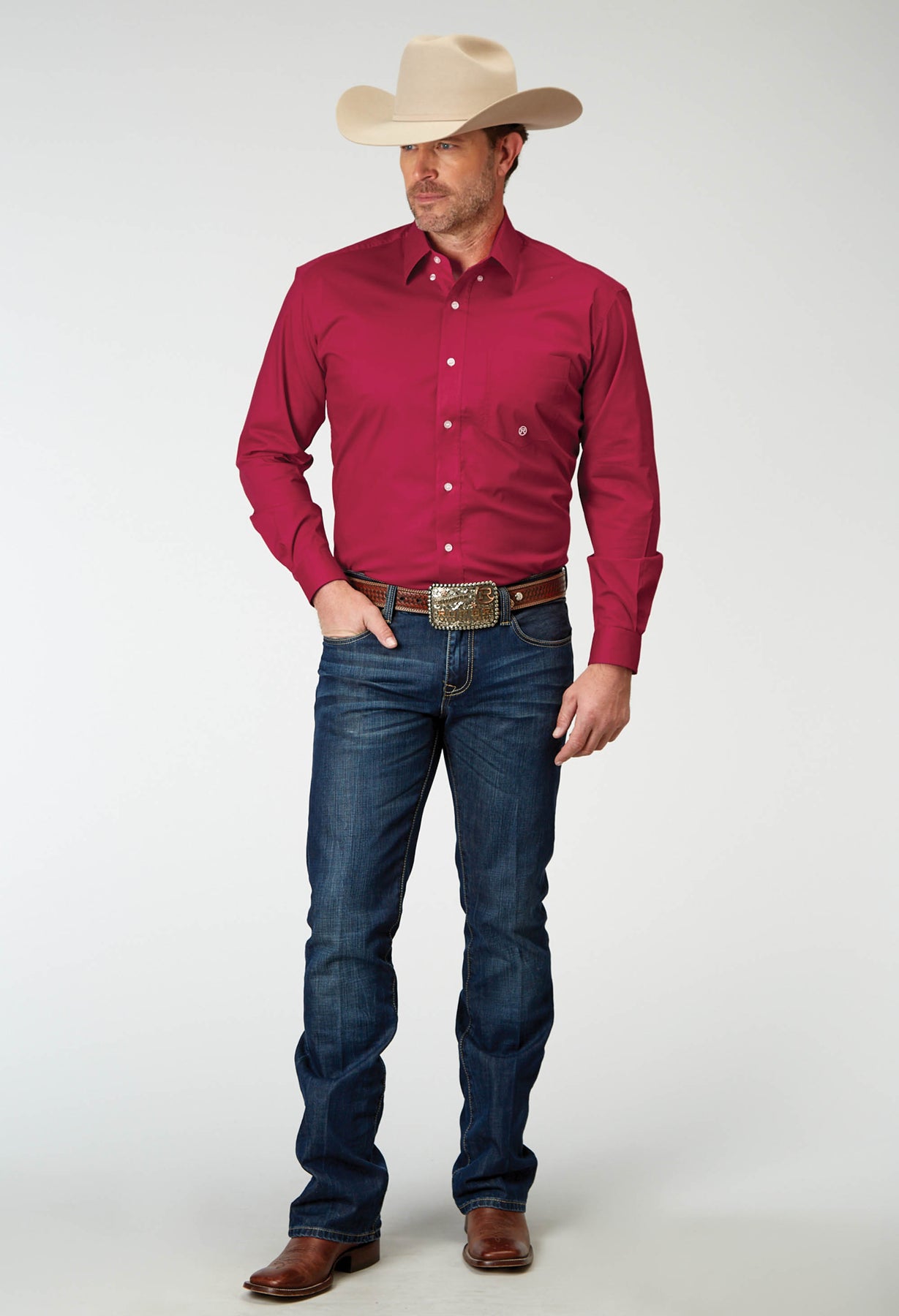Mens Long Sleeve Button Solid Poplin Stretch Red Western Shirt