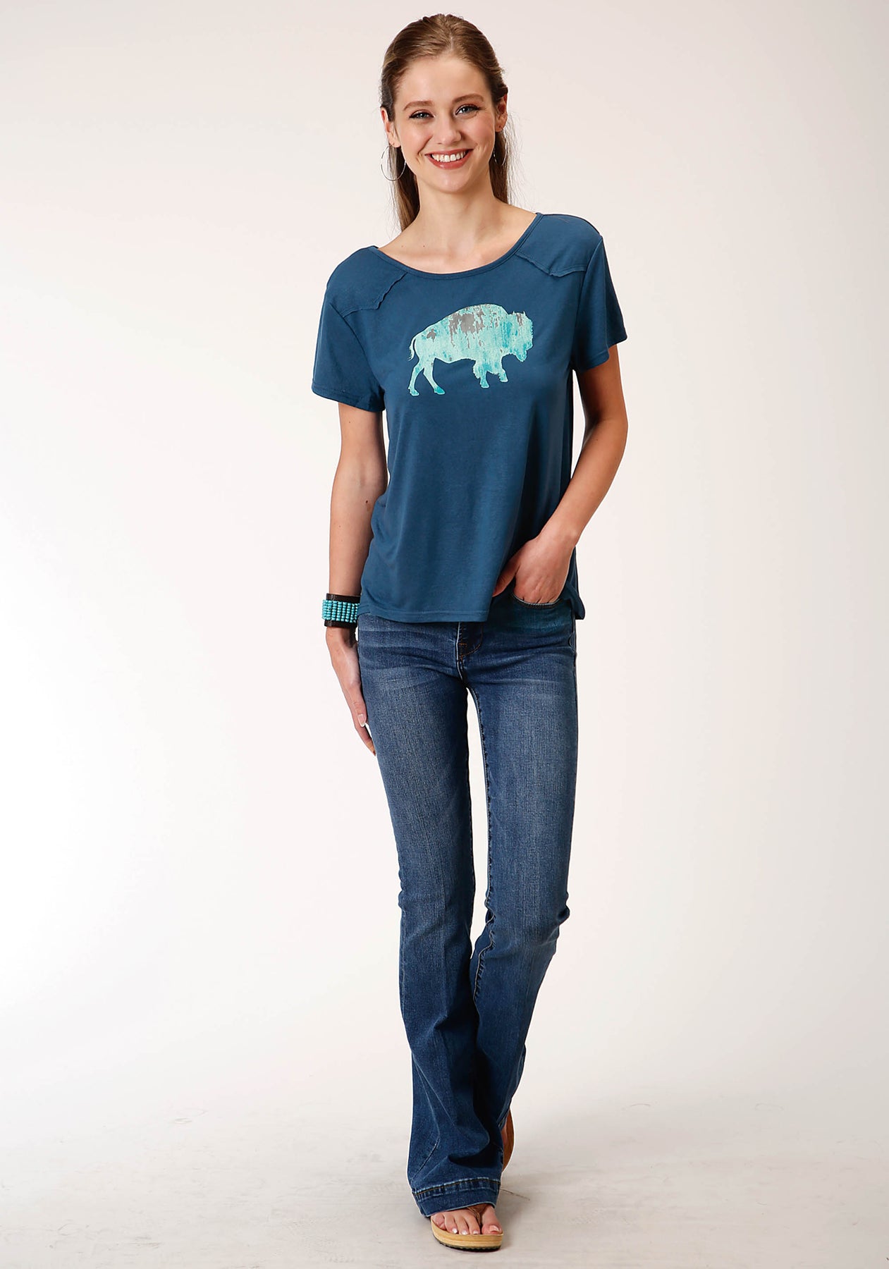 Womens Navy Blue Poly Rayon Swing Short Sleeve Knit Top