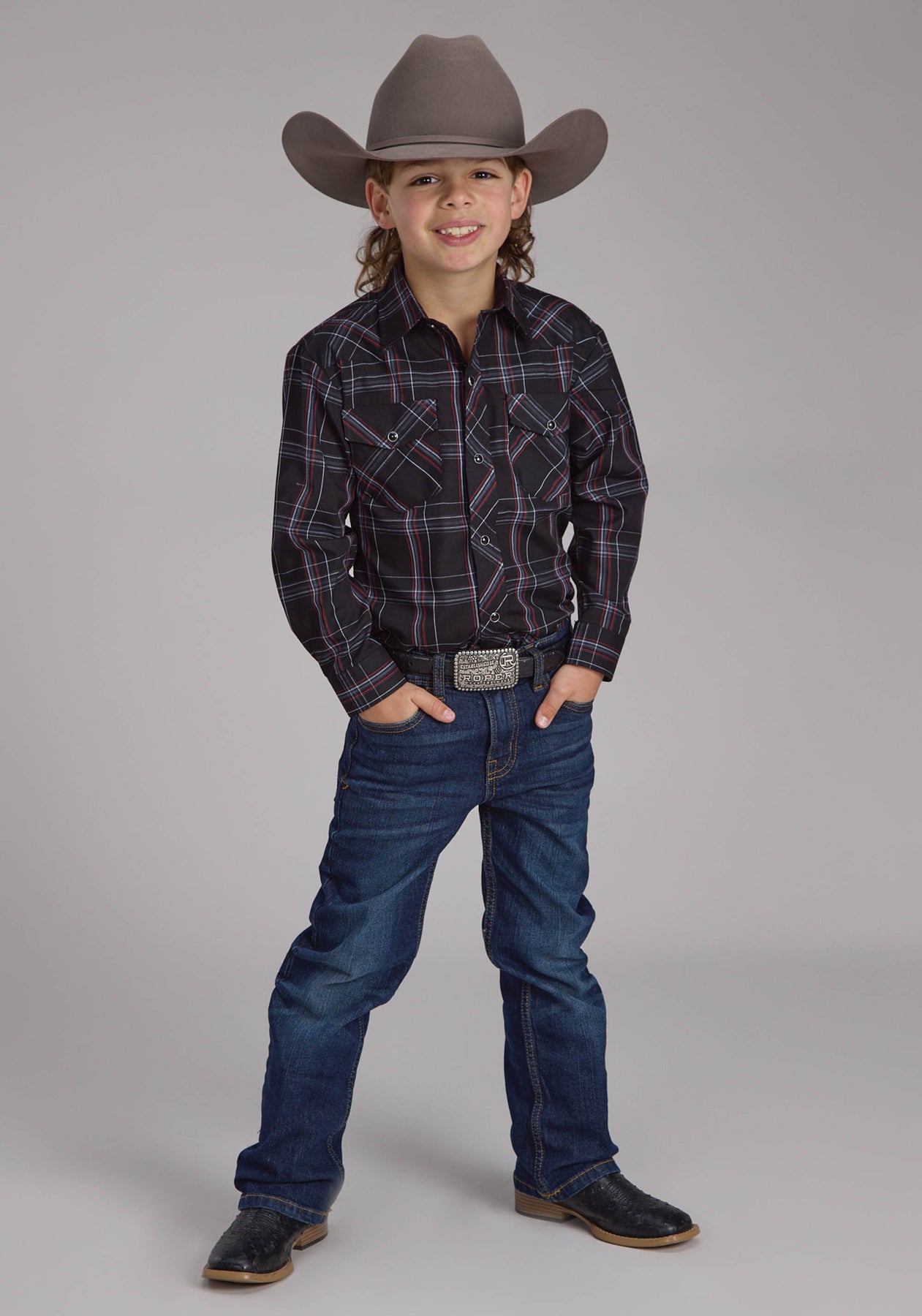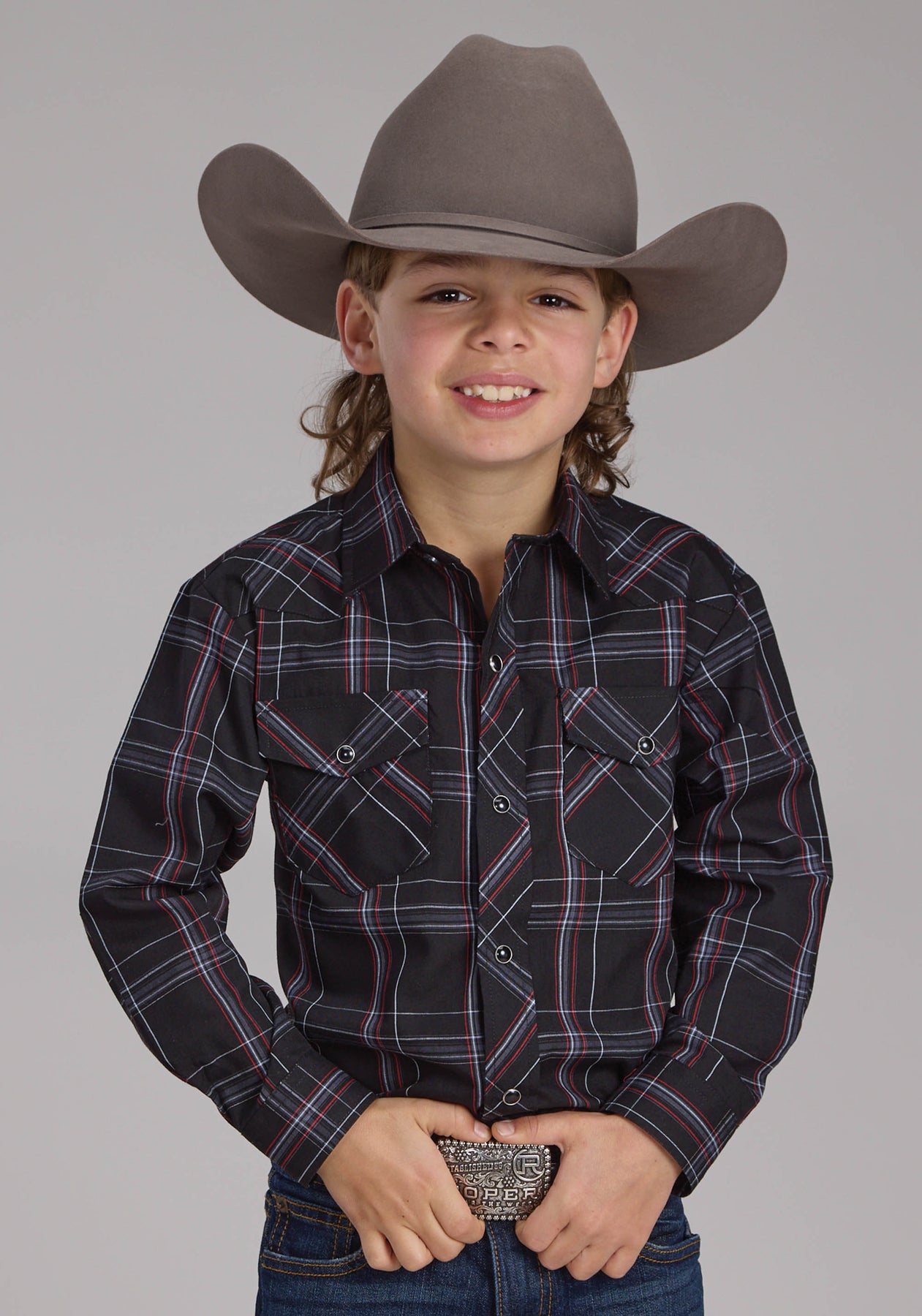 Boys Black Gray And Red Plaid Long Sleeve Snap Western Shirt