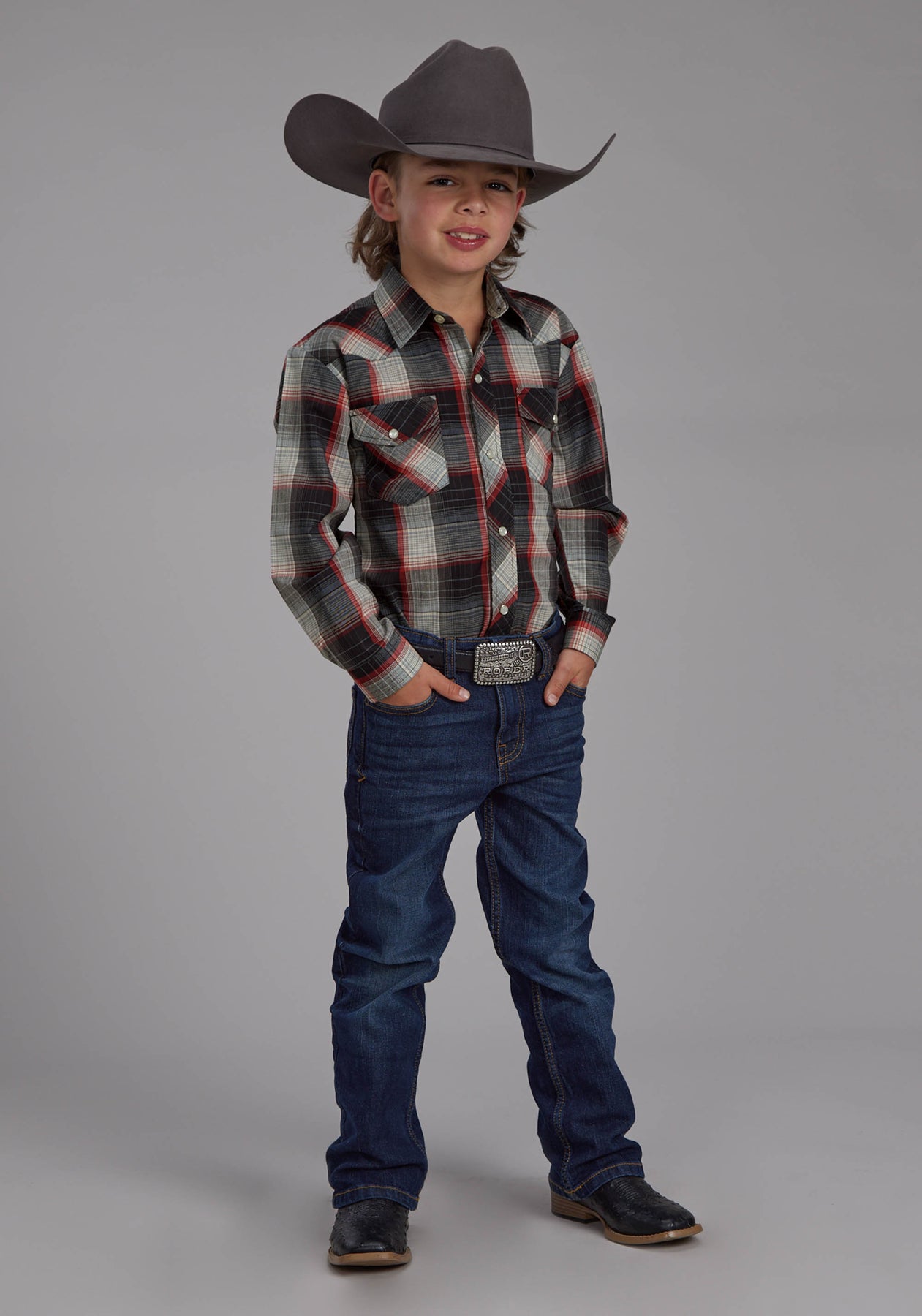 Boys Black, Gray, Cream And Red Plaid Long Sleeve Snap Western Shirt