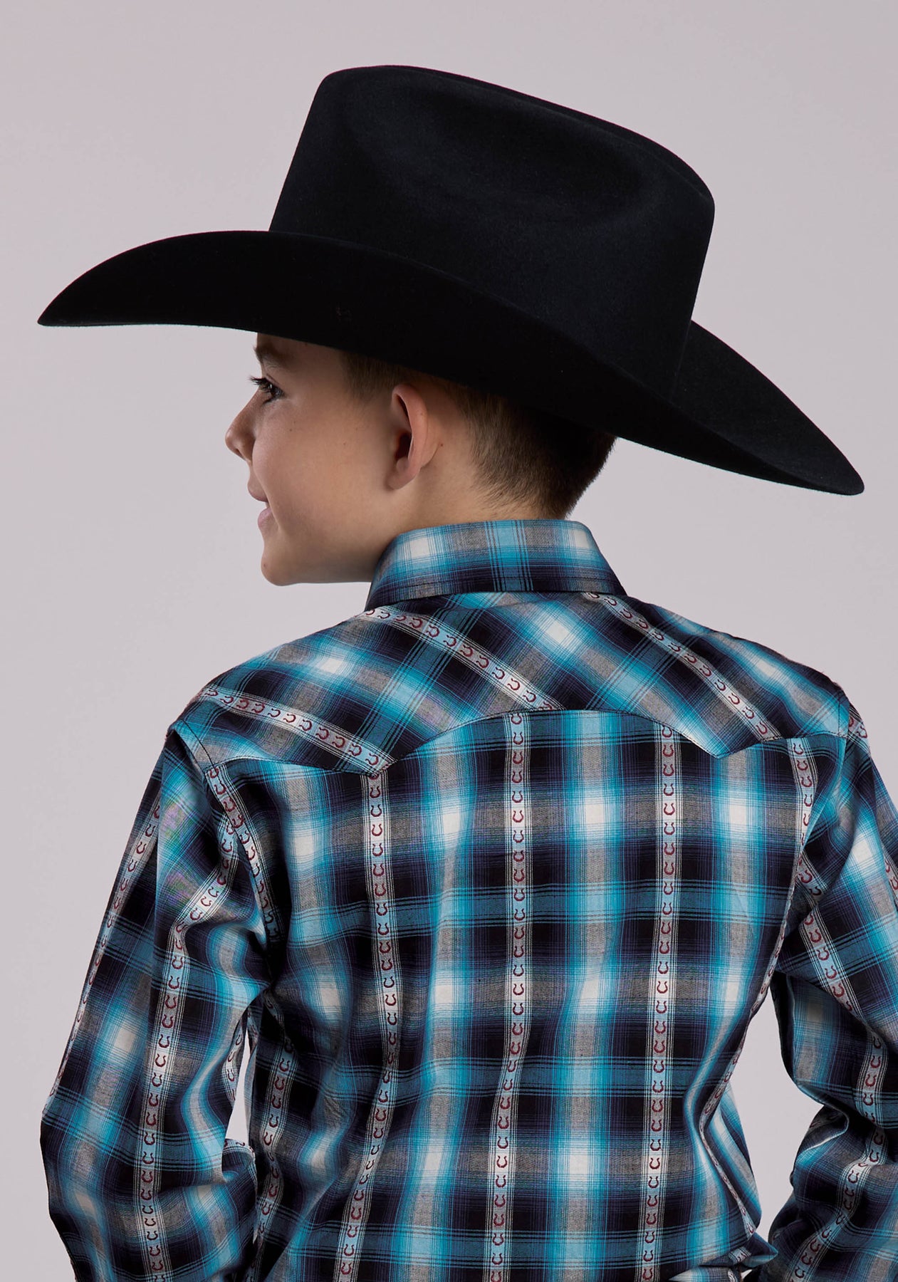 BOYS LONG SLEEVE SNAP HORSESHOE DOBBY PLAID WESTERN SHIRT