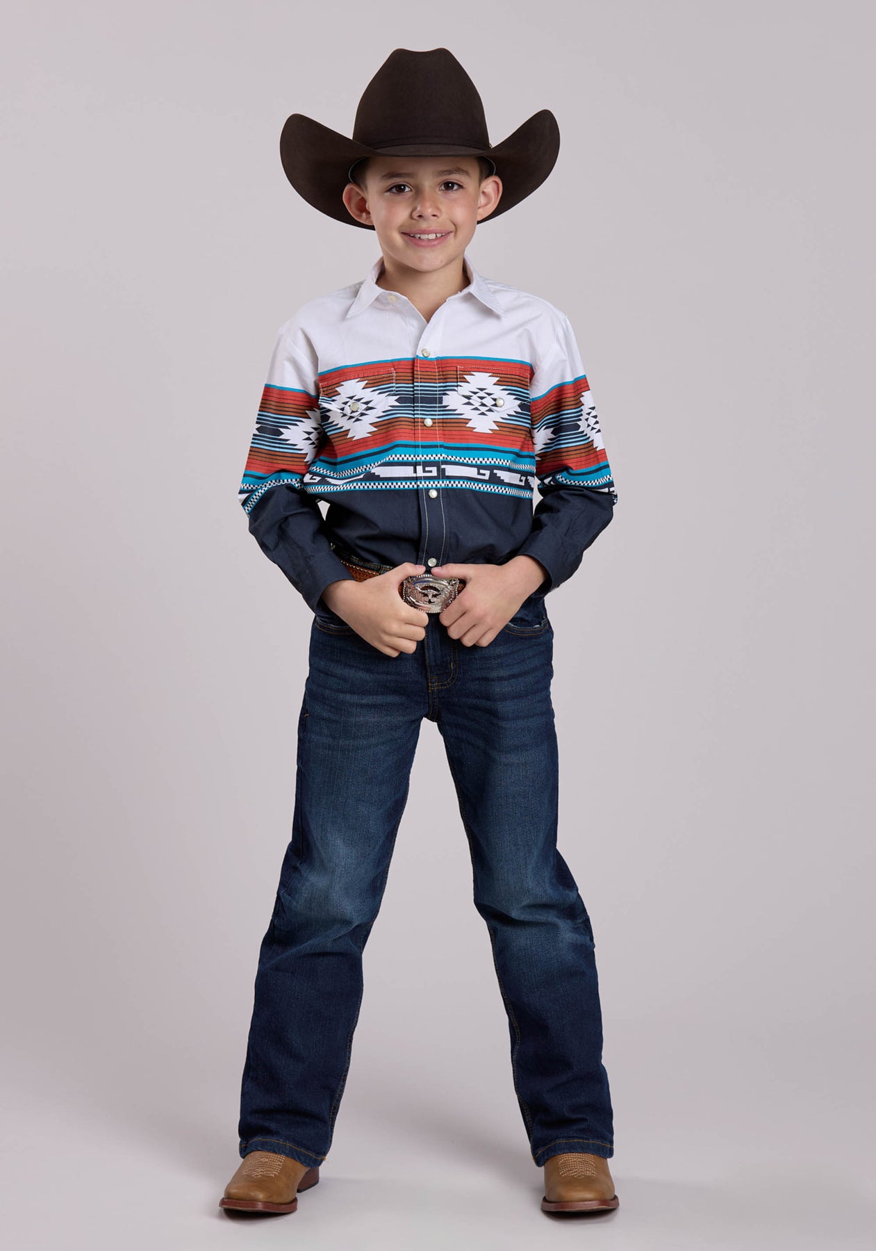 BOYS LONG SLEEVE SNAP HORIZONTAL AZTEC OMBRE BORDER PRINT WESTERN SHIRT
