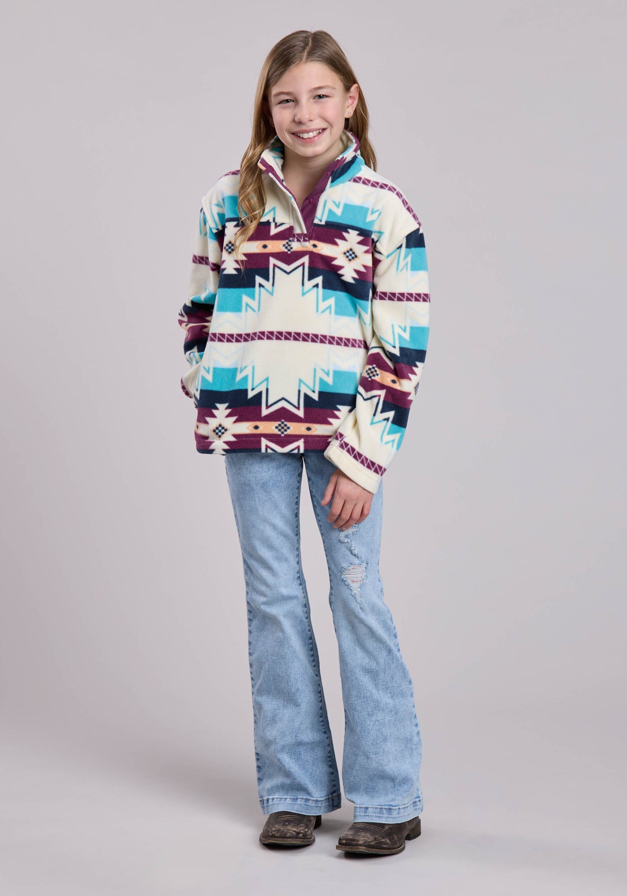 GIRLS JACKET SNAP LARGE AZTEC PRINT FLEECE PULLOVER WESTERN JACKET