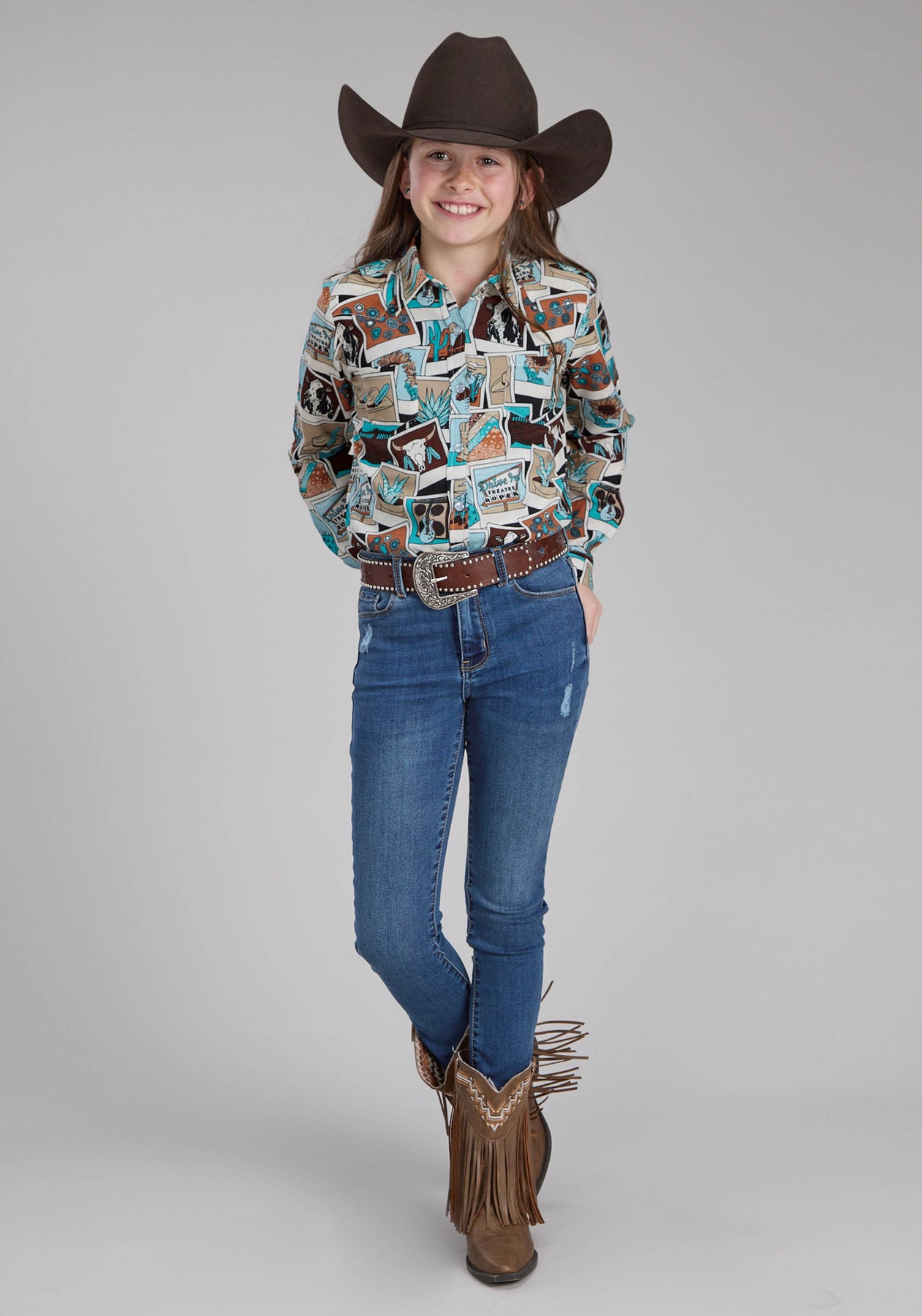 Girls Photo Collage Printed Rayon Long Sleeve Snap Western Shirt