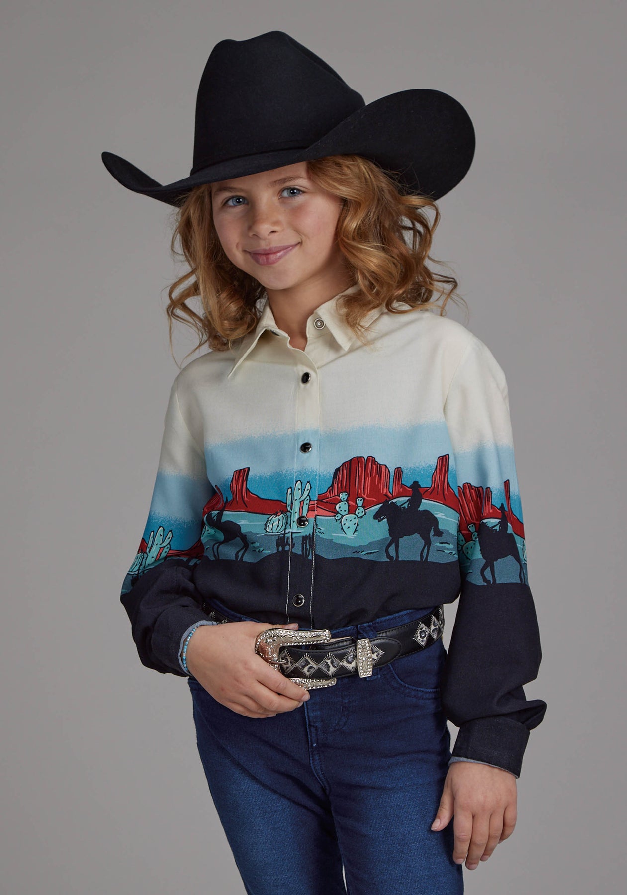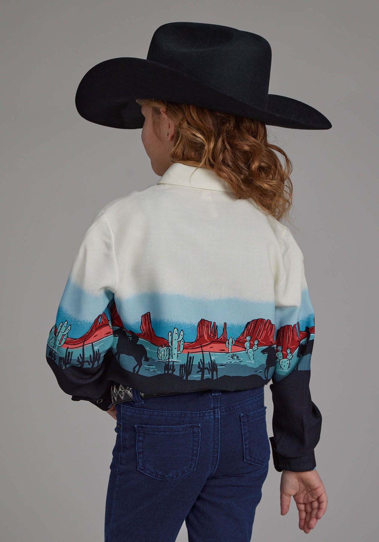 Girls Western Border Printed Rayon Long Sleeve Snap Western Shirt