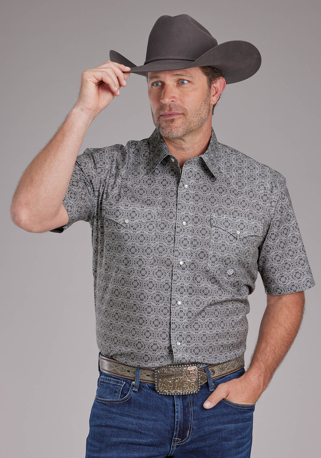 Mens Stretch Medallion Paisley - Gray Short Sleeve Snap Western Shirt
