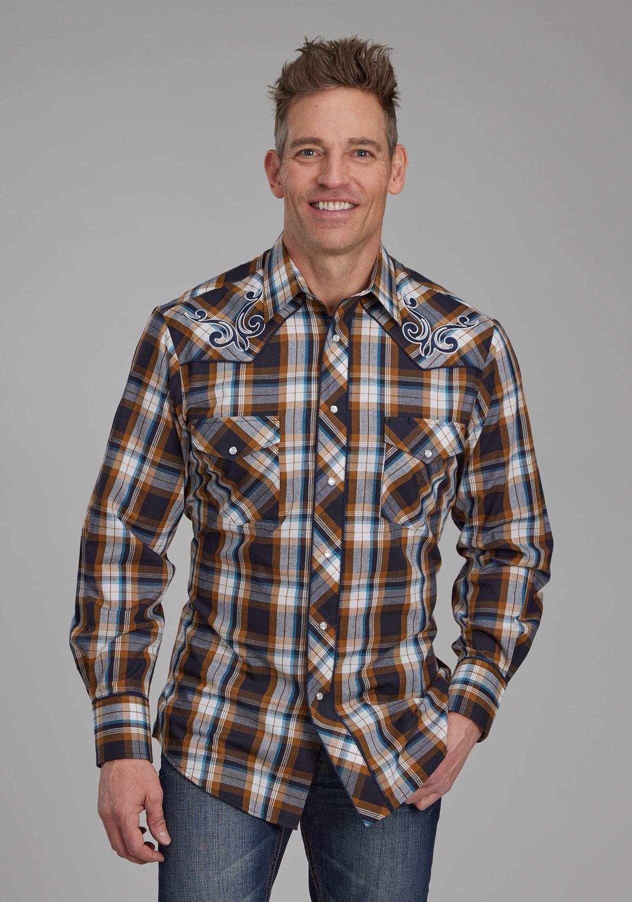 Mens Caramel Navy Cream And Teal Plaid Long Sleeve Snap Western Shirt