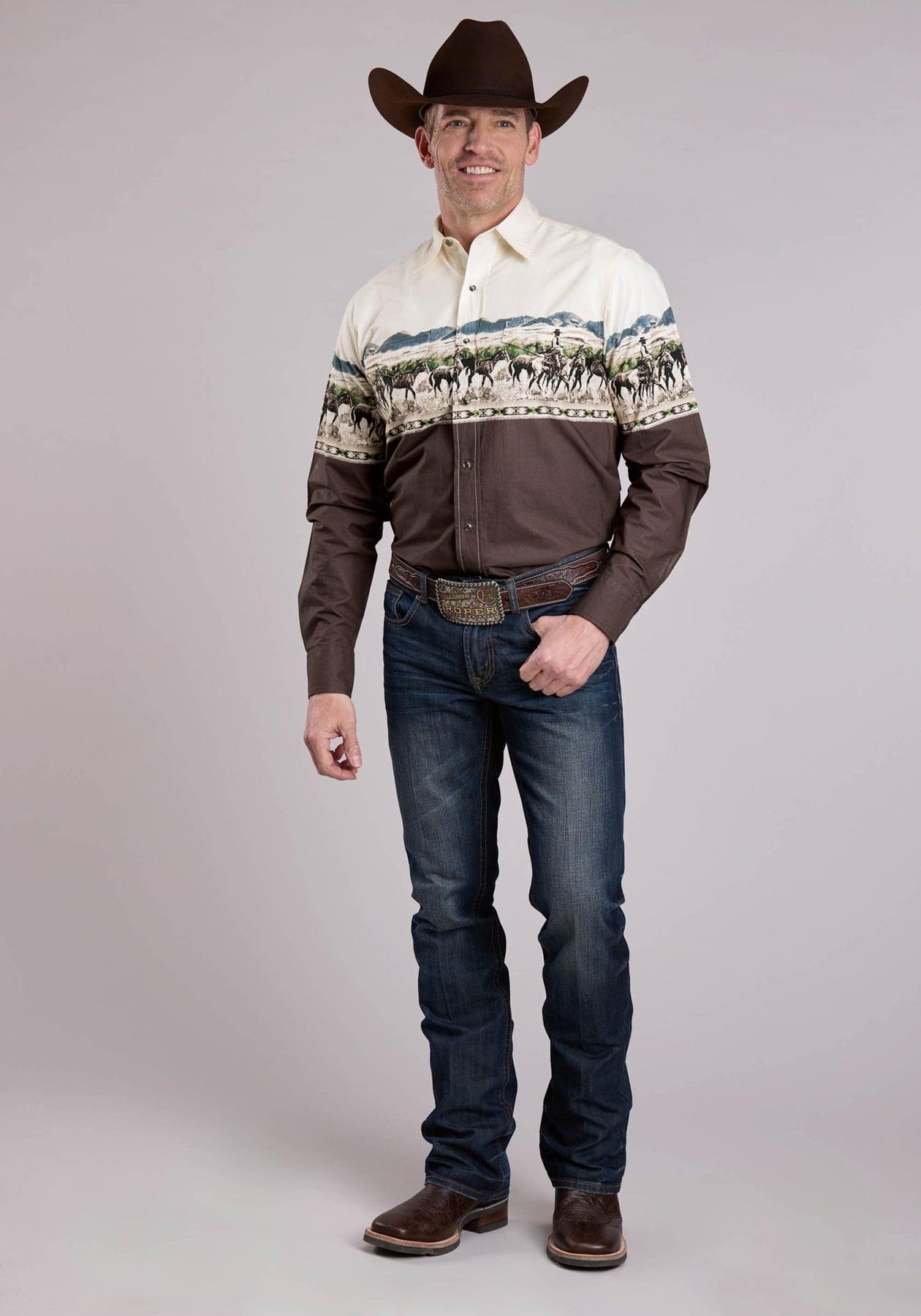 MENS LONG SLEEVE SNAP COUNTRY TRAILS SCENIC BORDER WESTERN SHIRT