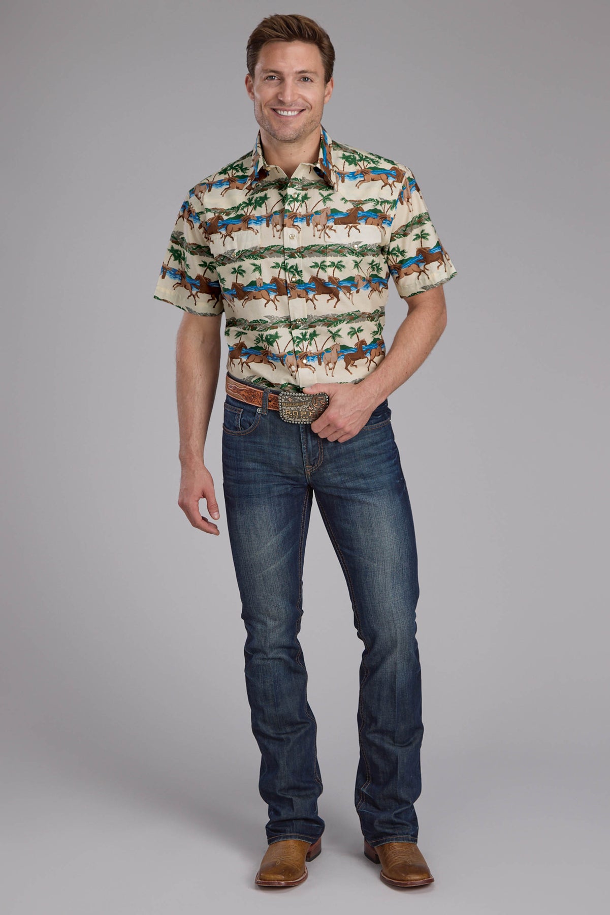 Mens 3 Tropical Horses Short Sleeve Snap Western Shirt