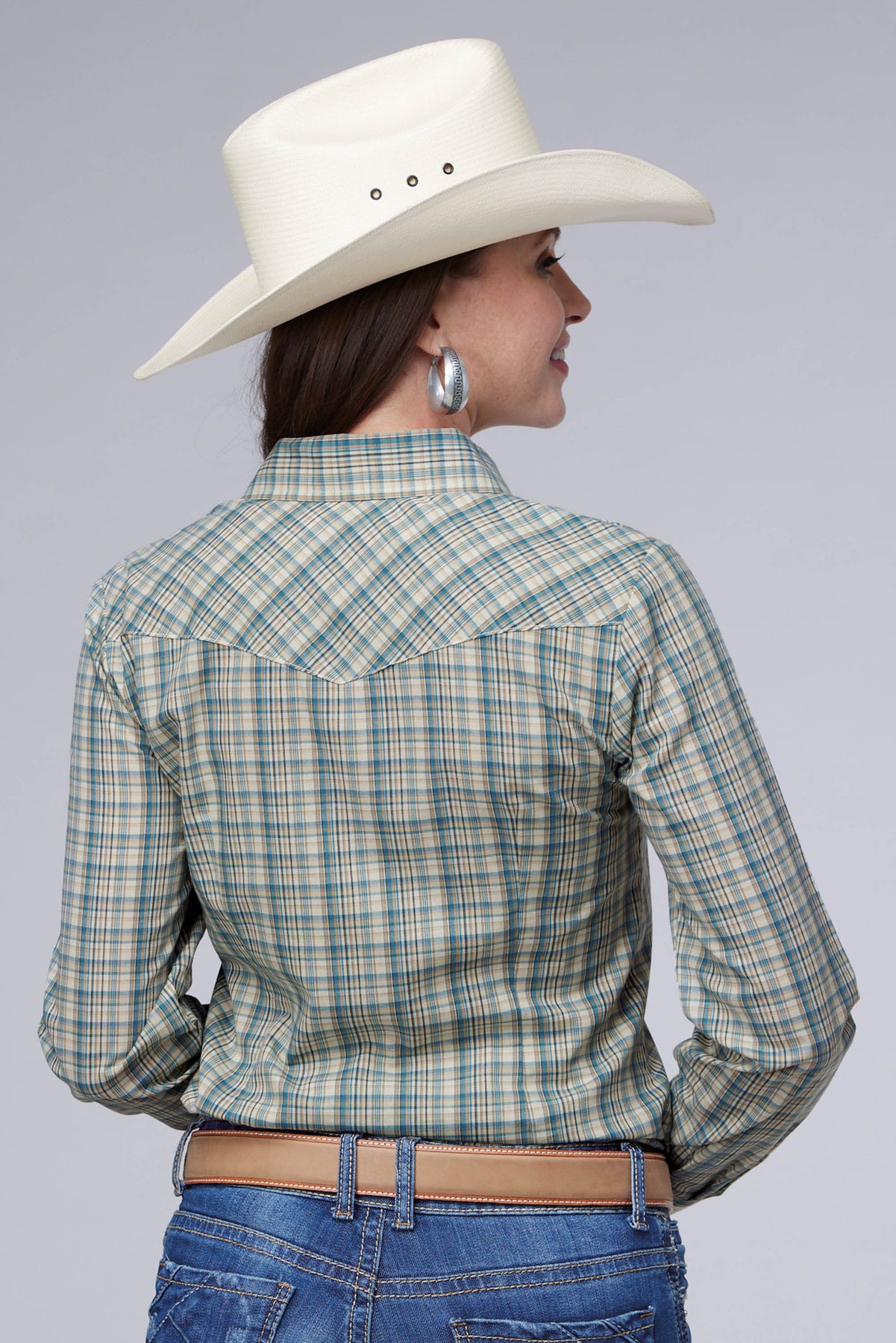 WOMENS CREAM TEAL AND TAN PLAID LONG SLEEVE SNAP WESTERN SHIRT