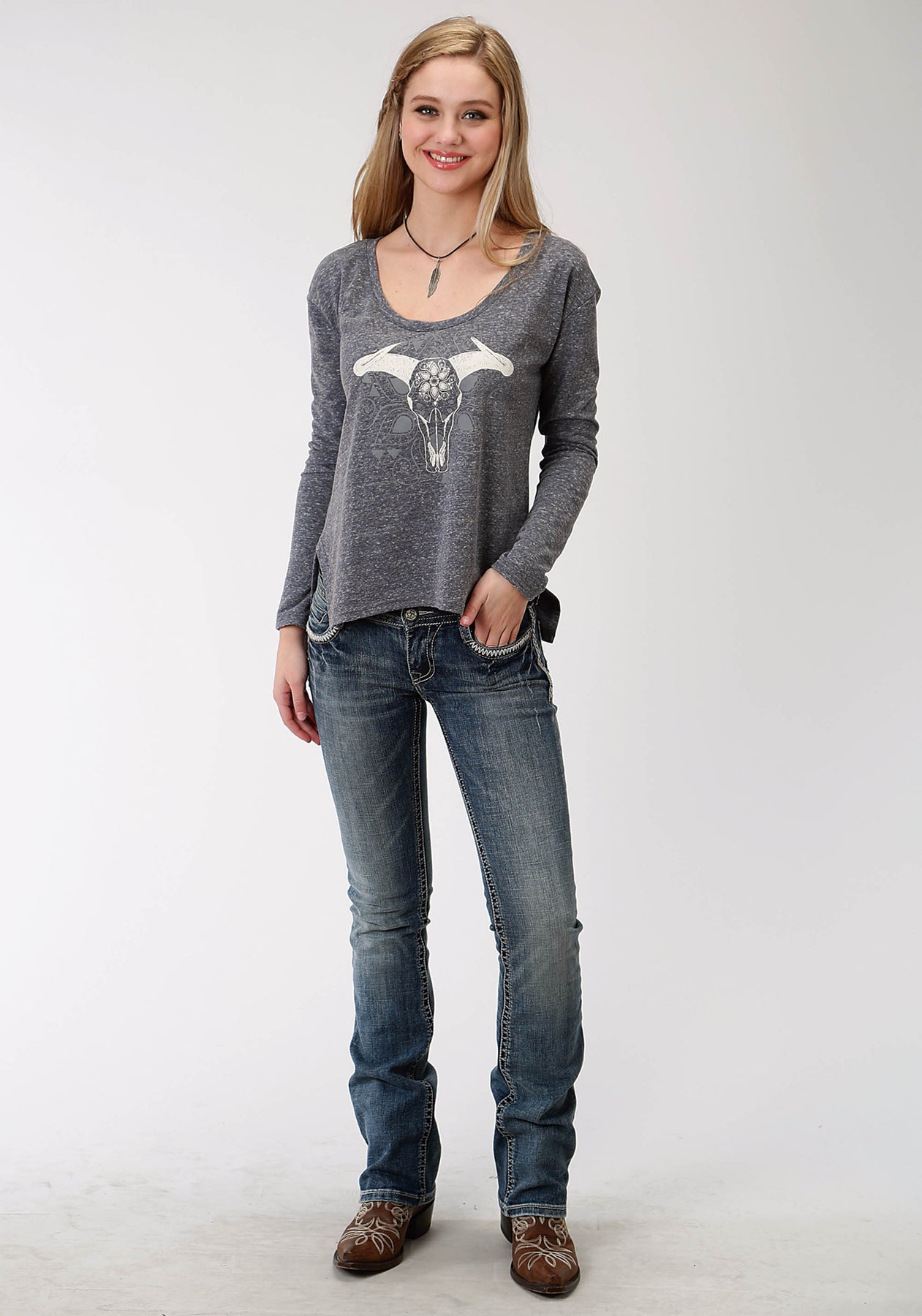 Womens Blue Solid With Screen Print Long Sleeve Knit Top