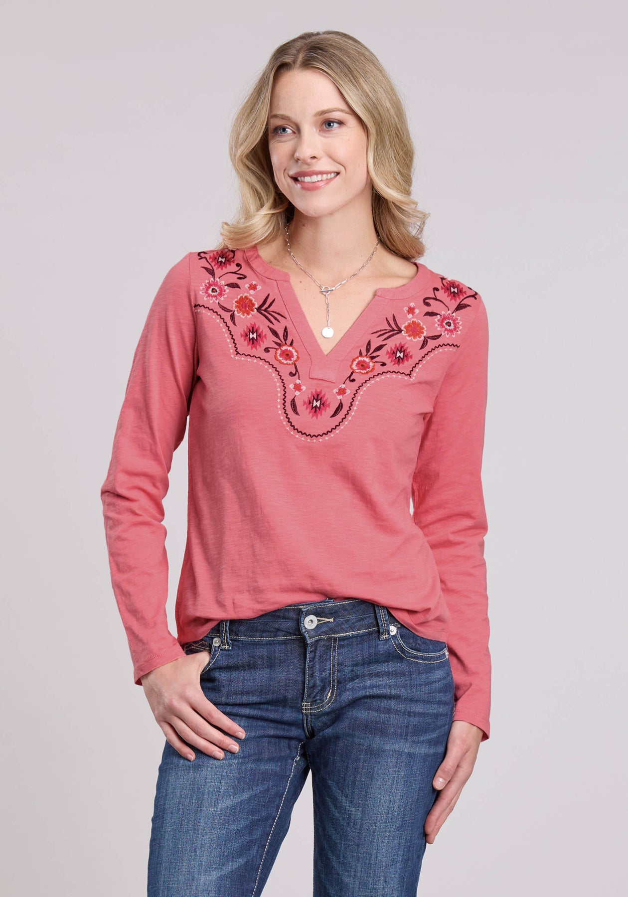 WOMENS LONG SLEEVE PULLOVER PINK SLUB COTTON JERSEY T-SHIRT WESTERN SHIRT