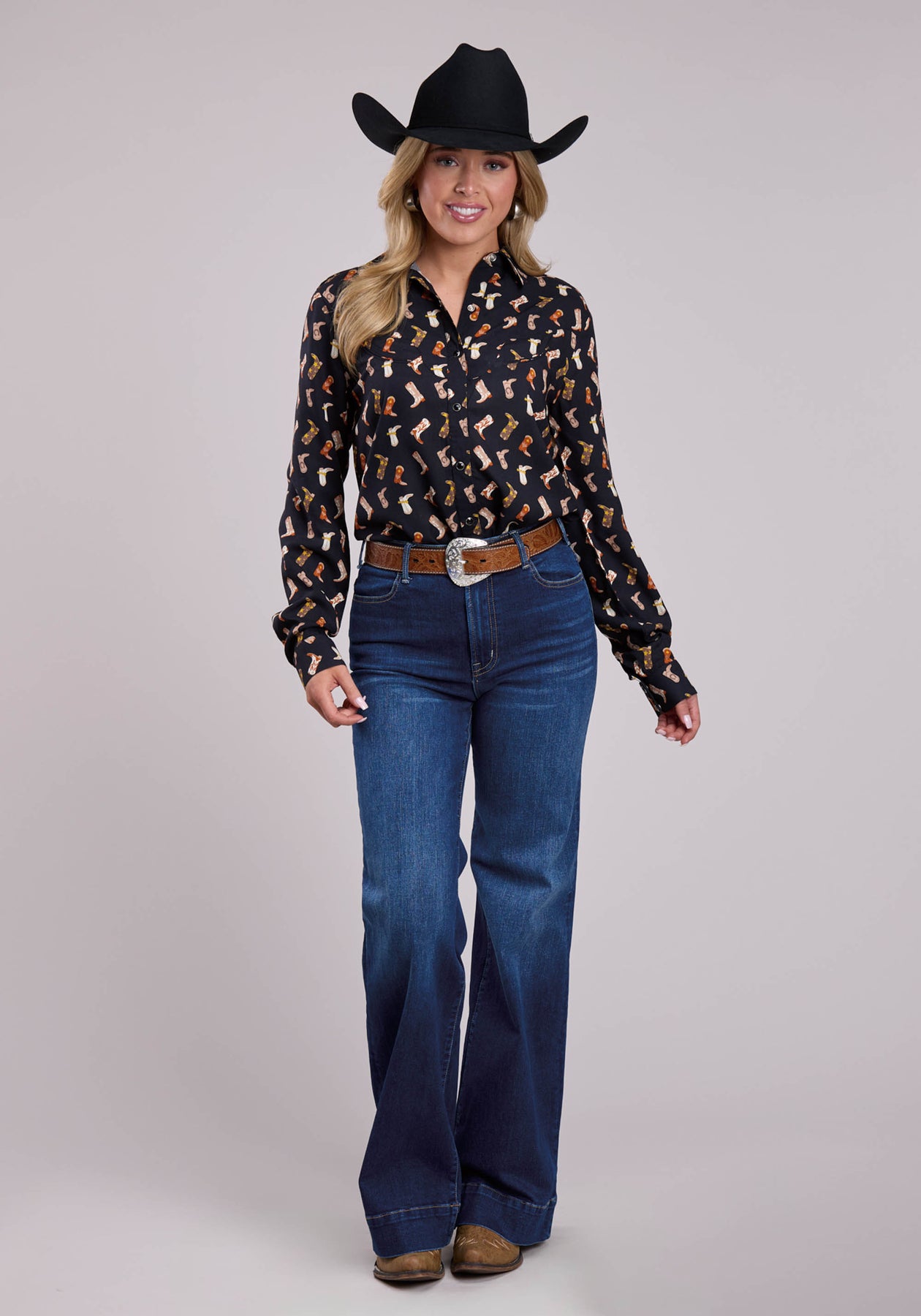 WOMENS LONG SLEEVE SNAP BOOT PRINTED RAYON WESTERN BLOUSE WESTERN SHIRT