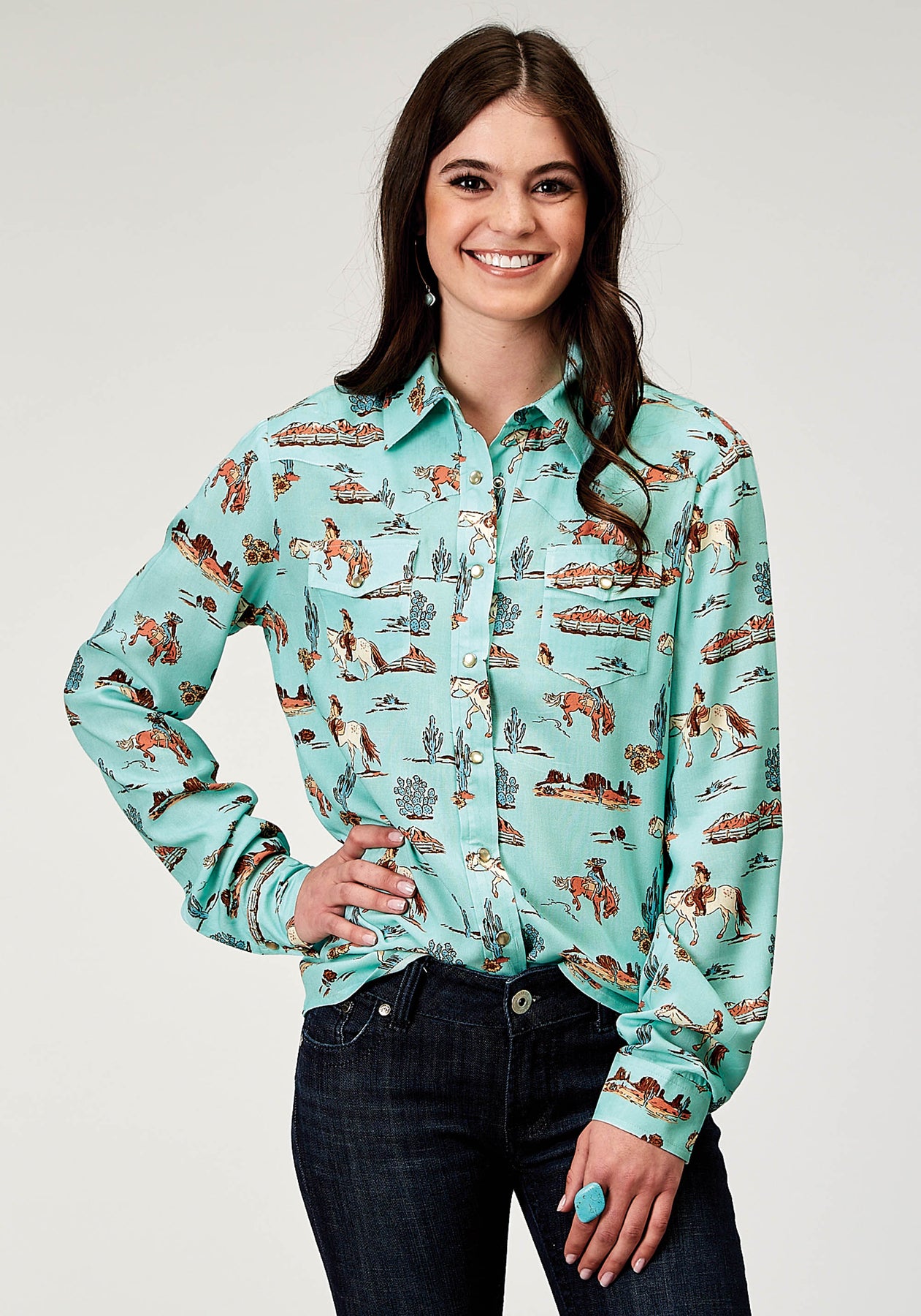 Womens Long Sleeve Snap Desert Toile Print Rayon Western Blouse