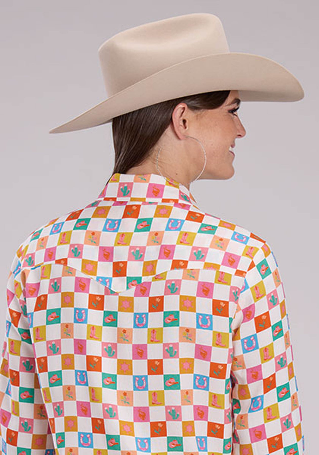 Womens Long Sleeve Snap Checker Print Rayon Western Blouse Western Shirt
