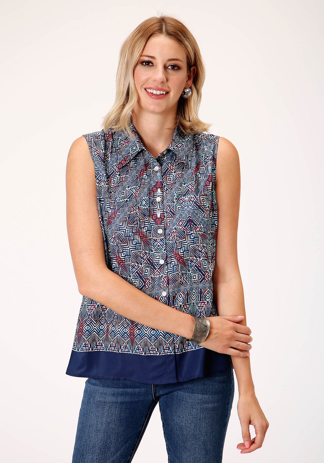 Womens Sleeveless Poly Crepe Tribal Border Print Blouse