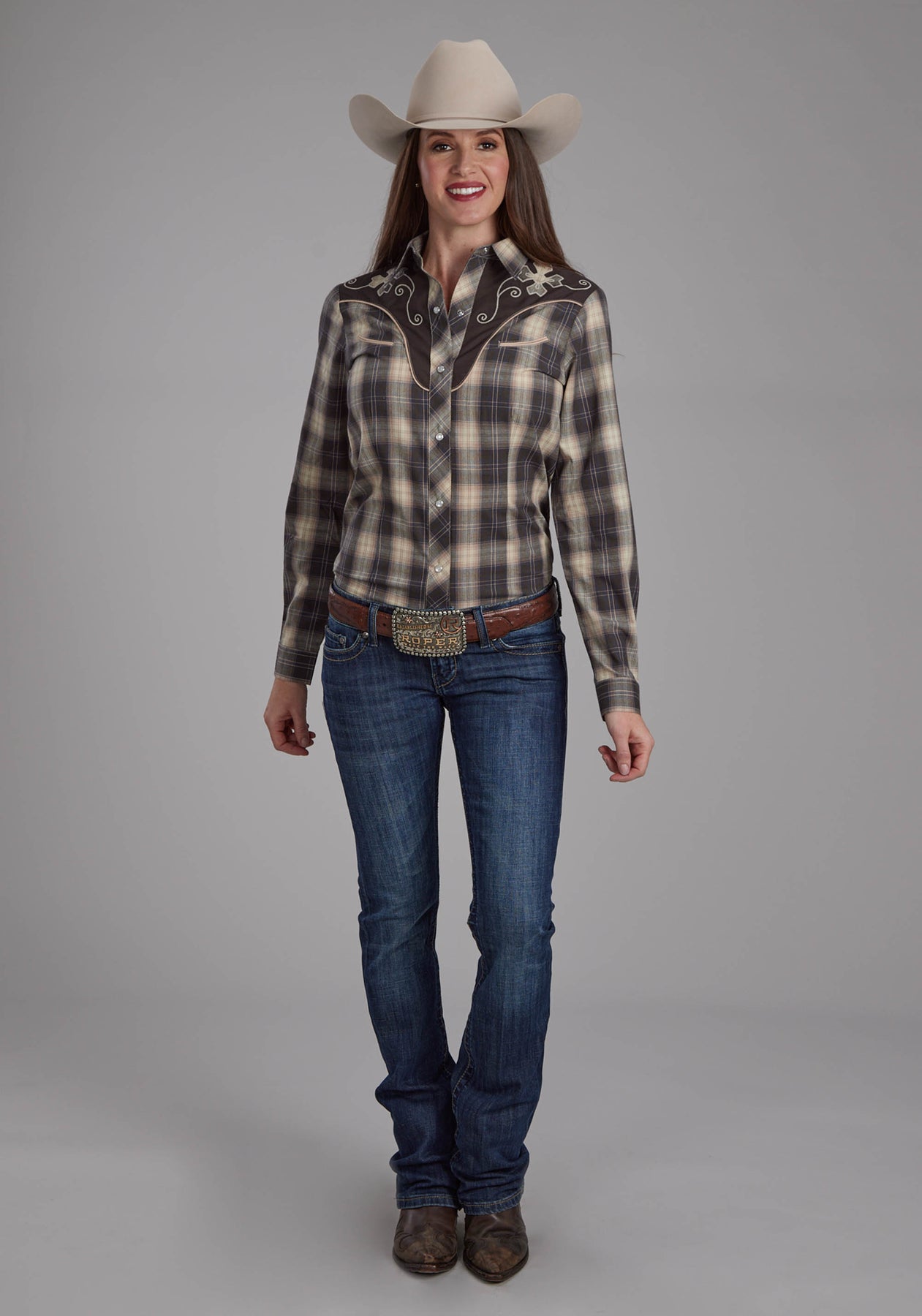 Womens Gray Cream And Tan Plaid Long Sleeve Snap Western Shirt