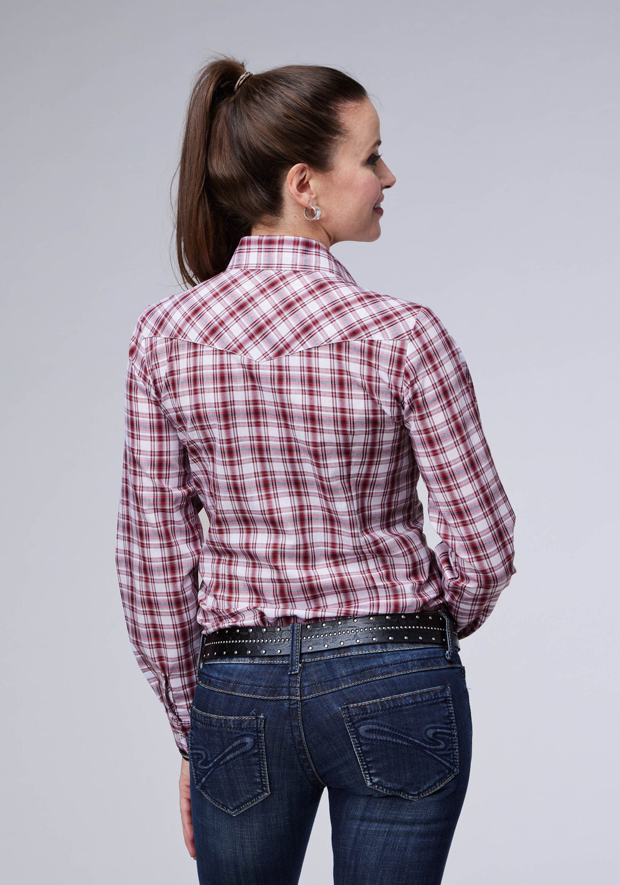 WOMENS RED WHITE AND GRAY PLAID LONG SLEEVE SNAP WESTERN SHIRT