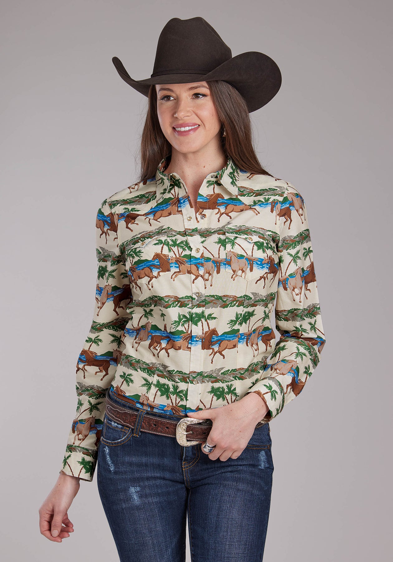 Womens 3 Tropical Horses Long Sleeve Snap Western Shirt