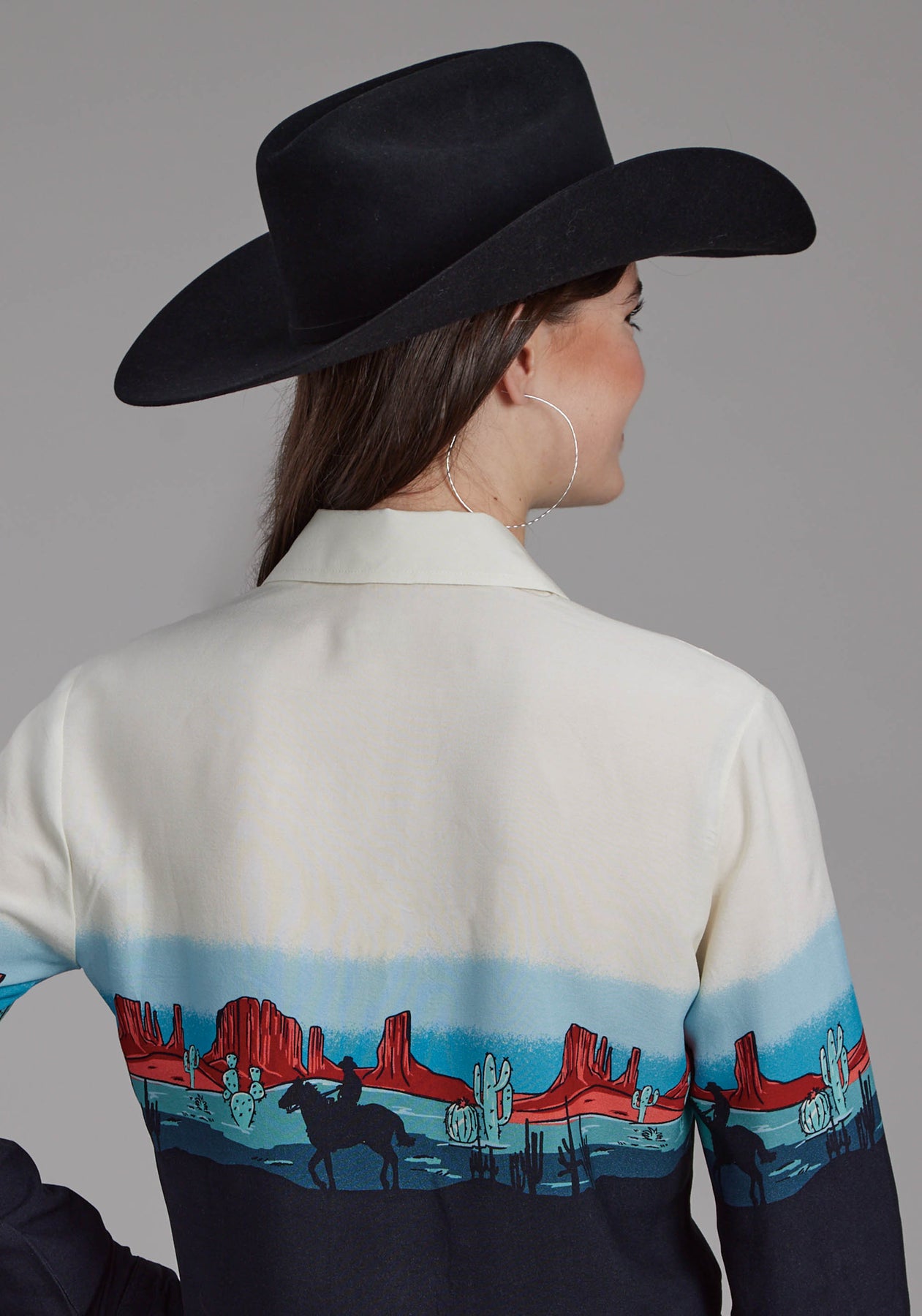 Womens Western Border Printed Rayon Long Sleeve Snap Western Shirt
