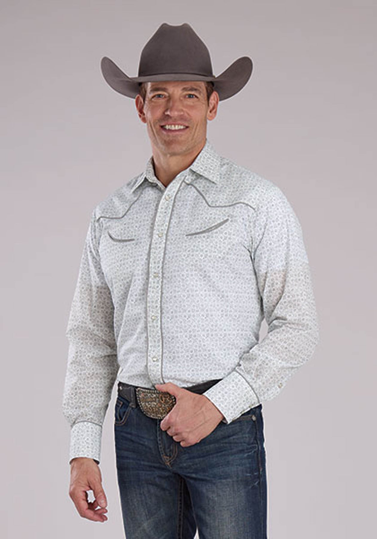 Mens Gray And White Floral Print Long Sleeve Snap Western Shirt