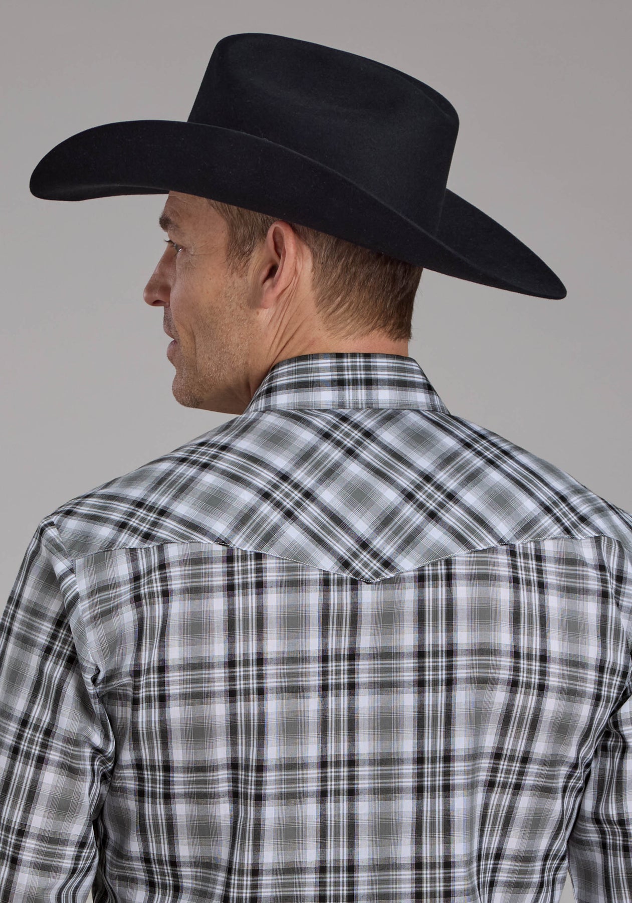 Mens Gray Black And White Plaid Long Sleeve Snap Western Shirt