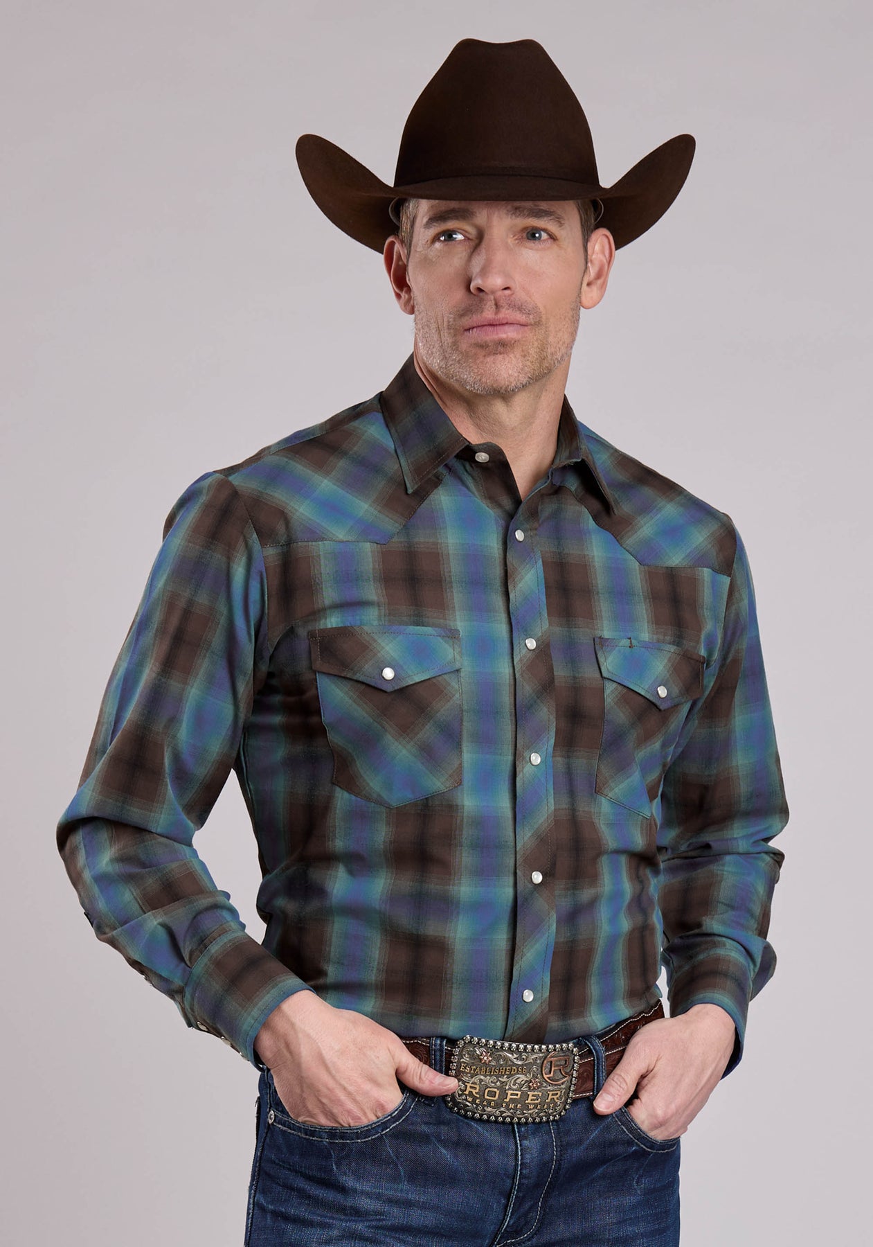 MENS LONG SLEEVE SNAP TURQUOISE COBALT CHOCOLATE PLAID WESTERN SHIRT