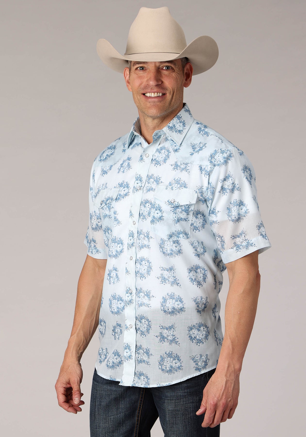 MENS MULTI BLUE FLORAL PRINT SHORT SLEEVE SNAP WESTERN SHIRT