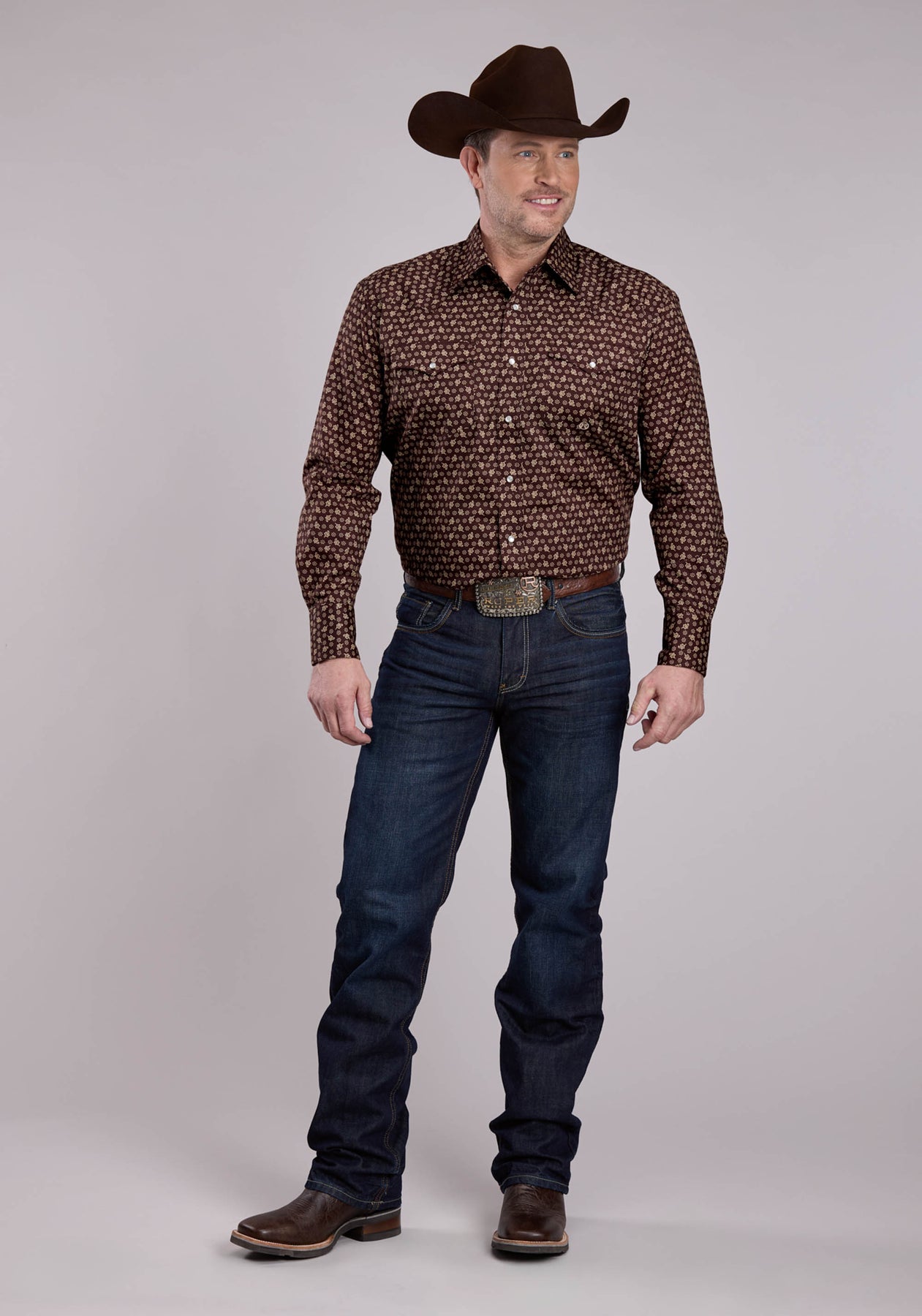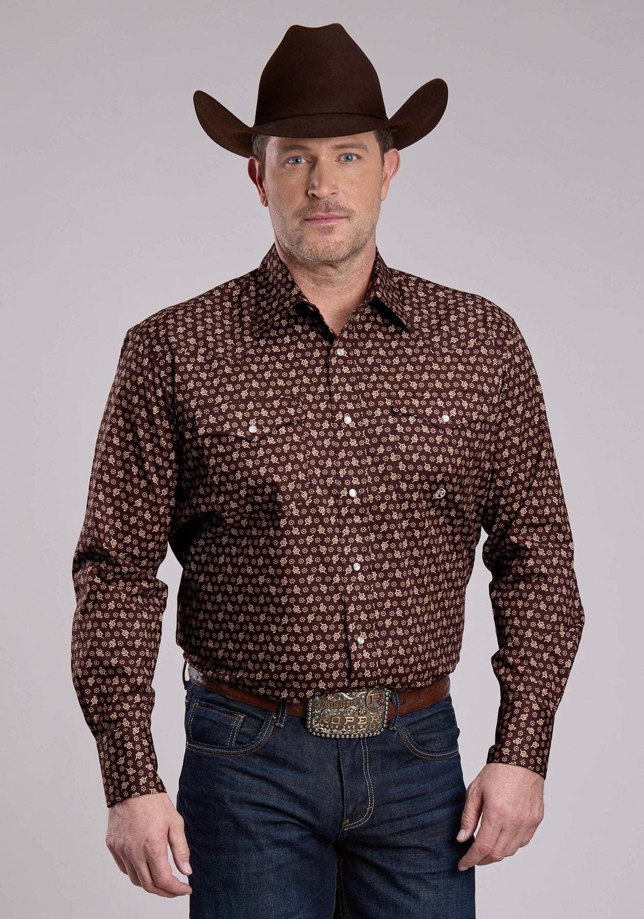 MENS LONG SLEEVE SNAP STRETCH POPLIN PAISLEY - BROWN WESTERN SHIRT
