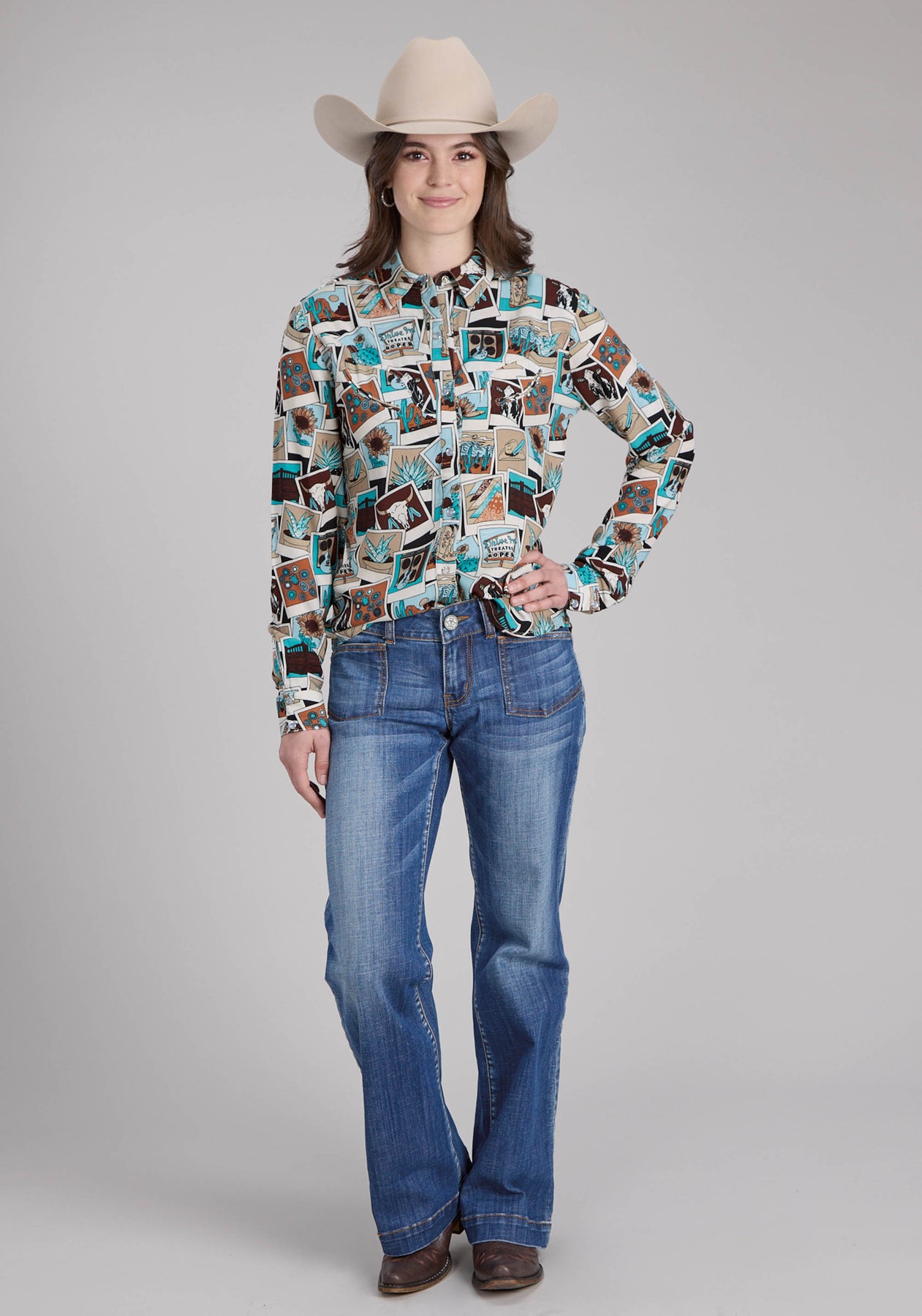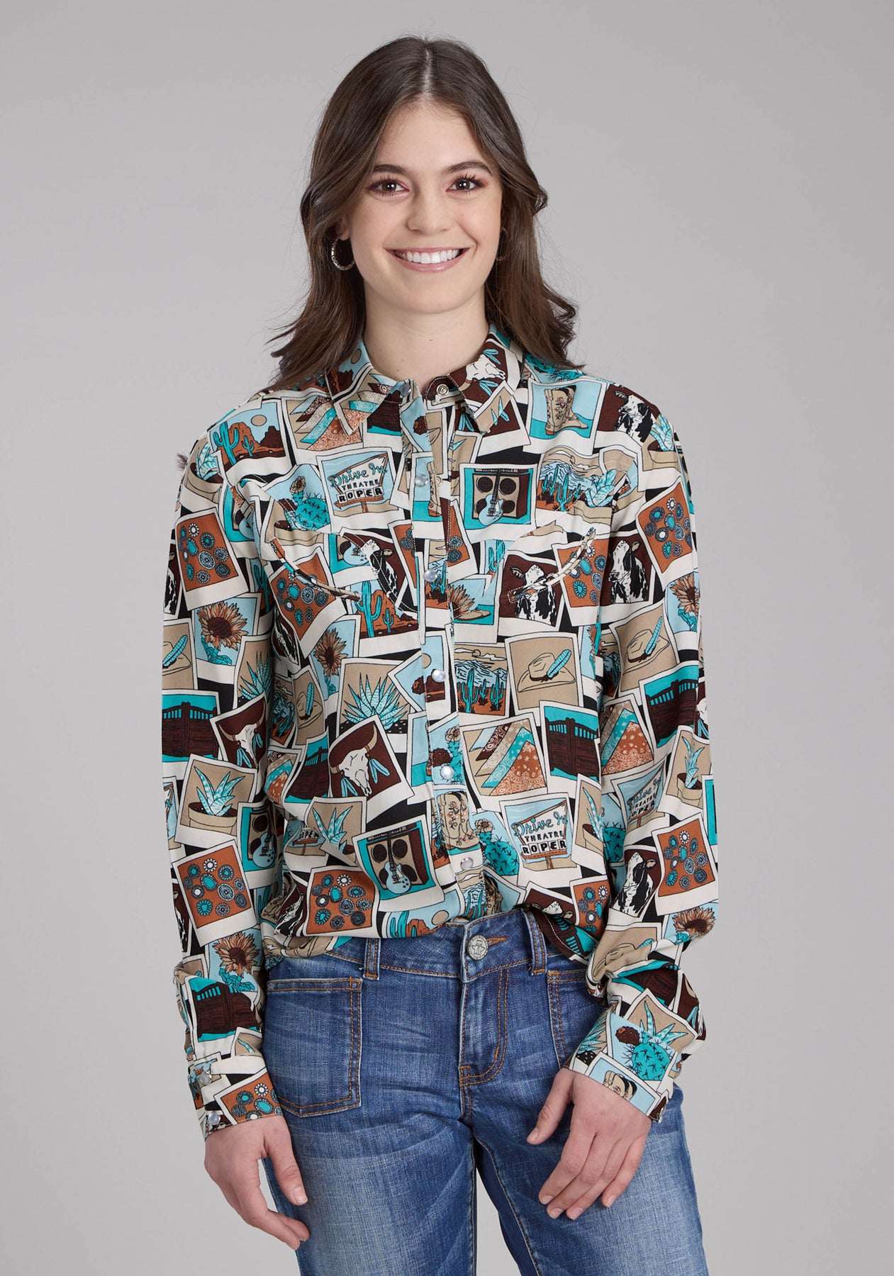 Womens Photo Collage Print Rayon Long Sleeve Snap Western Shirt