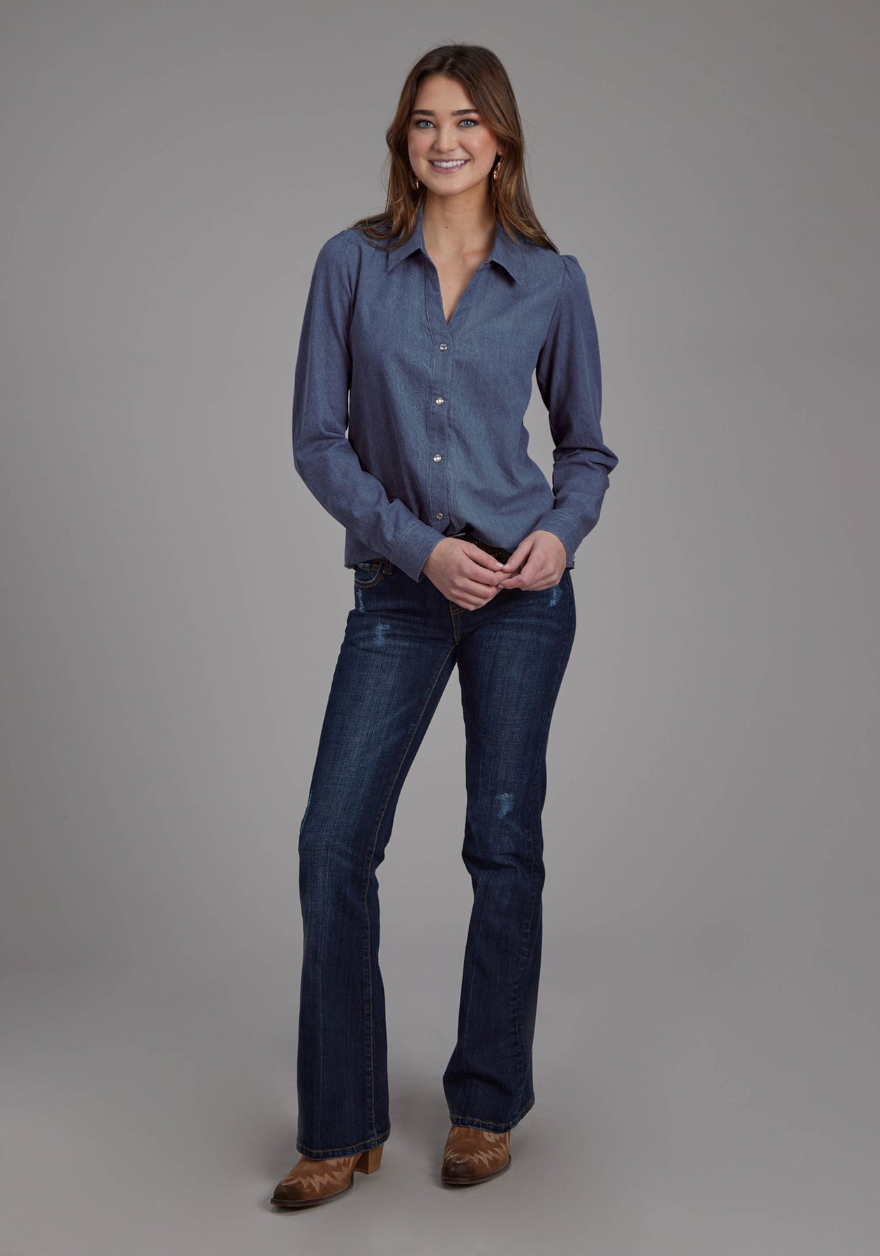 Womens Medium Denim Blue Western Shirt Long Sleeve Snap Western Shirt